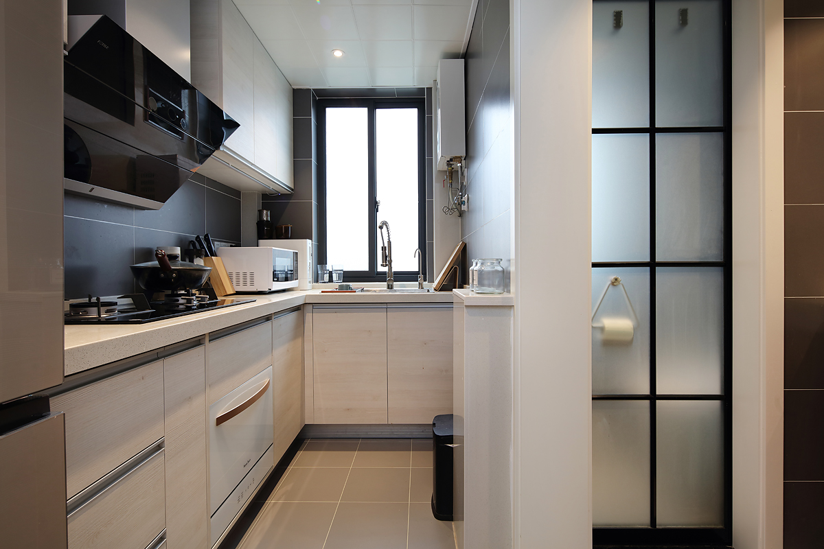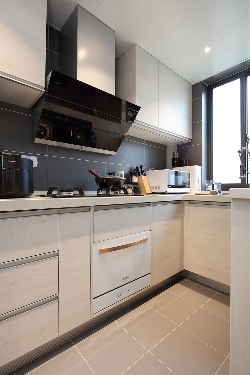 深色的瓷磚和淺色的櫥柜搭配起來很合理,消毒柜被內嵌放進櫥柜里看,美觀整潔,不占空間。