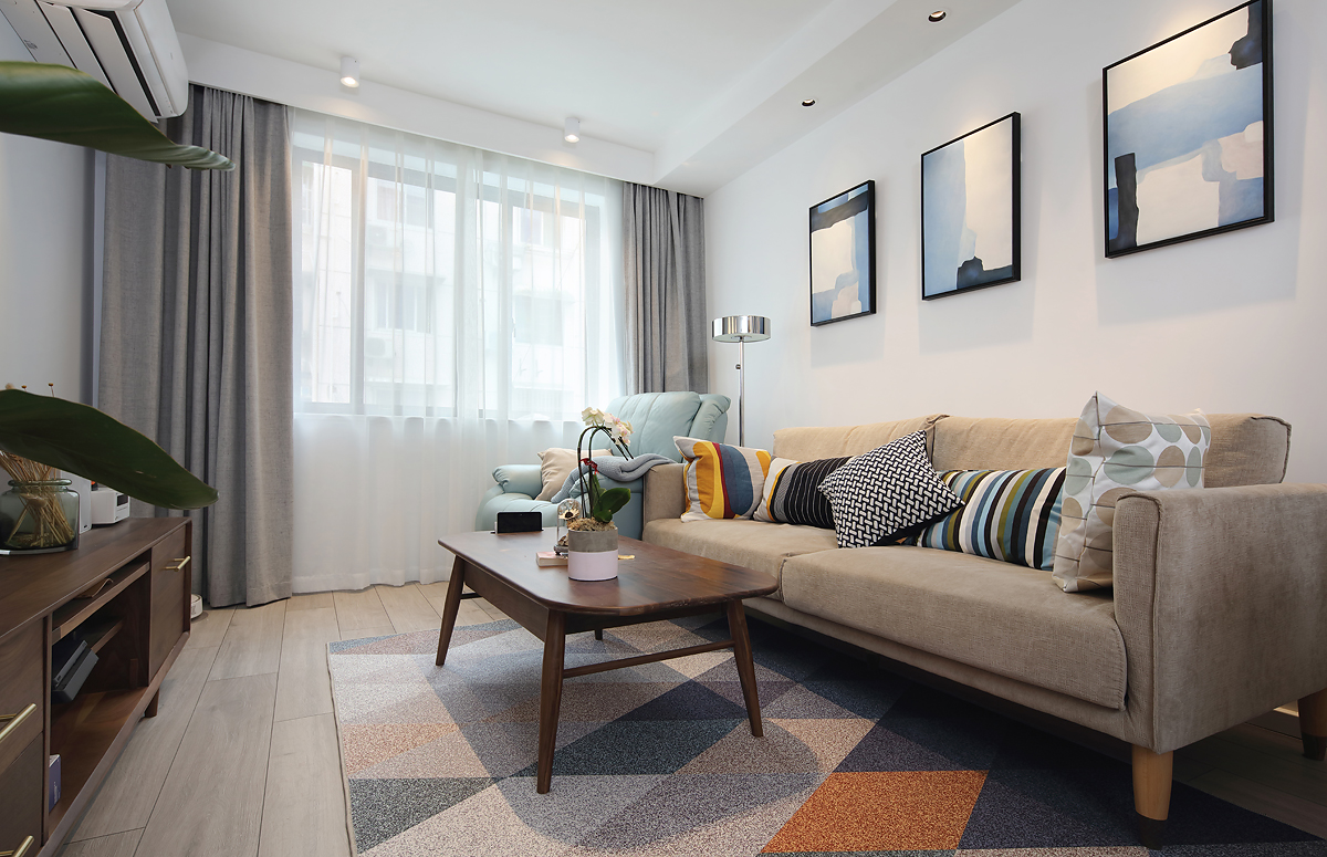 花樣繁多的拼色抱枕和棱格拼色地毯的存在,是為了給客廳增加一點活潑的色彩。這就感覺是,在沙發這張畫紙上添點色彩,讓客廳的層次感更為豐富。
