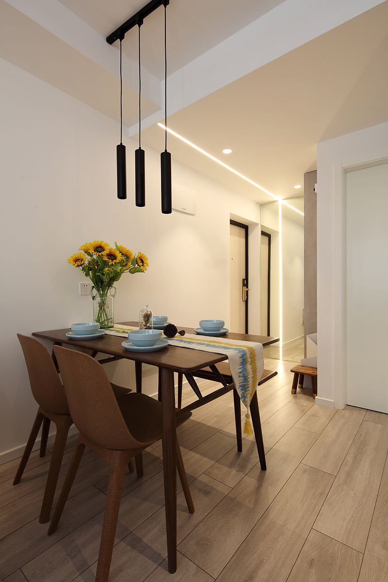 餐廳的桌椅和客廳的茶幾是類似的質地,簡約風的圓柱狀吊燈美觀又實用。