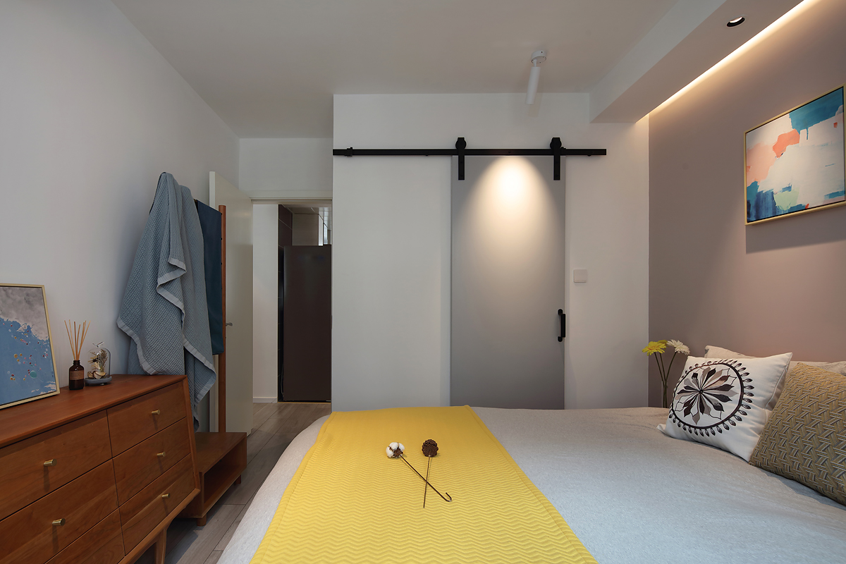 床頭的背景墻跟駝色相近,藏光的設計很是獨特。臥室的光源不需要很多,只要夠用就好。