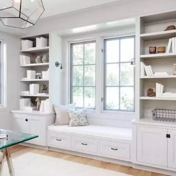 有些戶型本身沒有飄窗,設計師用定制組合柜的方式,為戶型量身定制了一個“假飄窗”。而這樣的“假飄窗”不但能夠作為一個休閑之處,還是一個絕佳的收納場所,用來放置一些不常用的小工具最合適不過了。