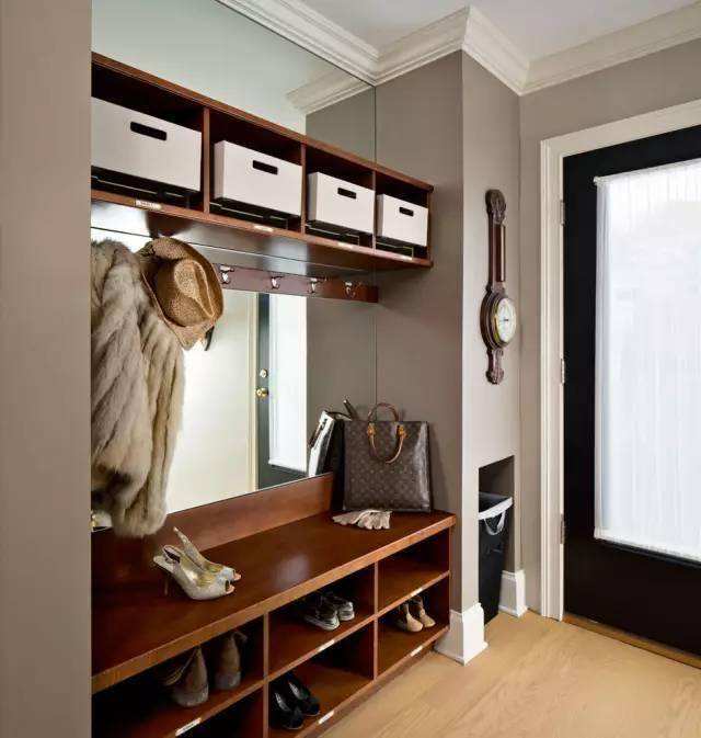 在布置玄關的時候,我們可以根據玄關的空間大小,安置一個換鞋的地方。像這樣的換鞋卡座,就是個不錯的選擇。卡座不僅美觀,還有一定的收納功能,可以用來放置襪子、手套之類的物件。