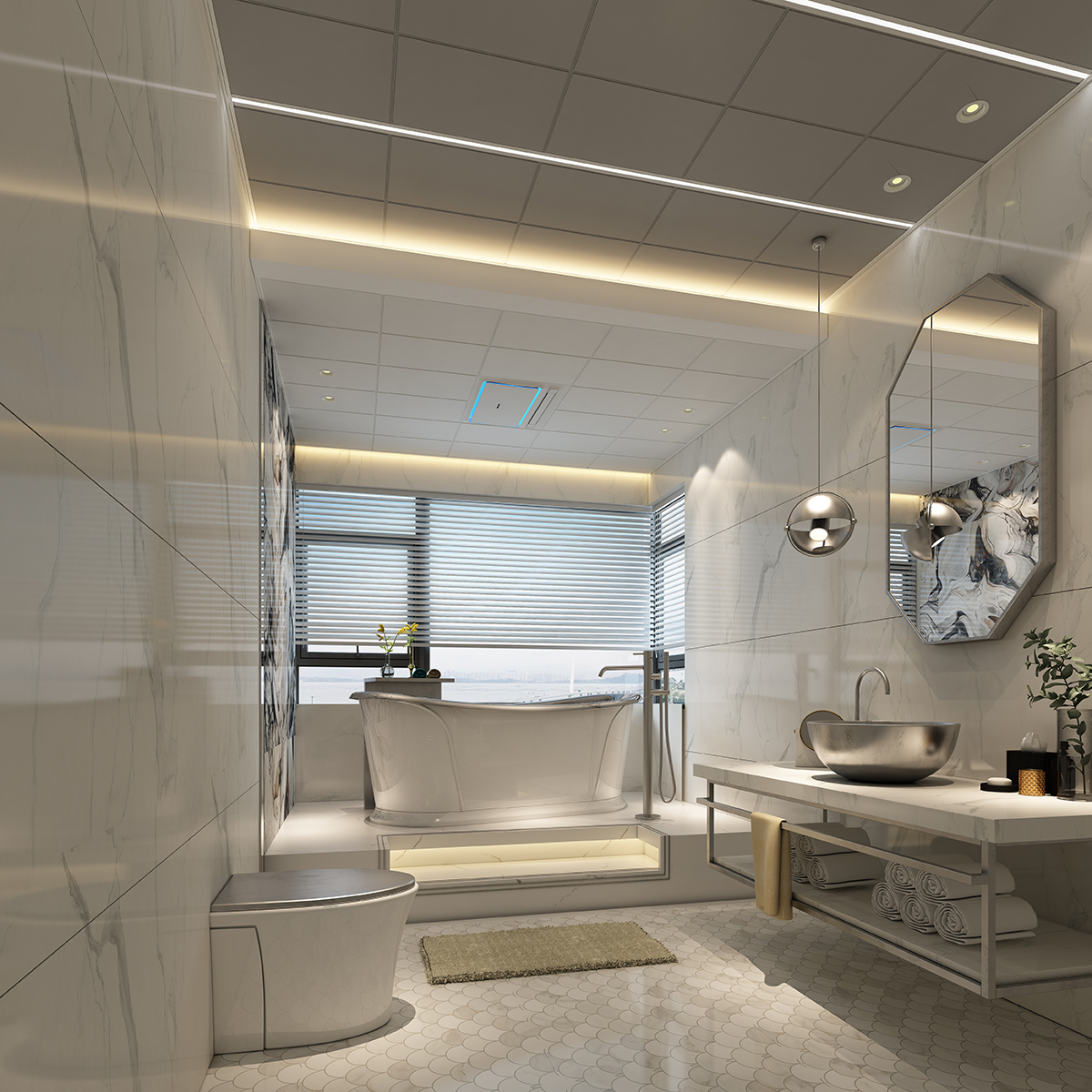 浴室的燈要做到見光不見燈,選用光線柔和的燈能讓人放松感受,為了避免看不清而摔倒需要安置多個光源。