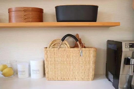 如果需要擺放的物品色彩豐富且多雜,例如精致小巧的咖啡杯和廚房用的毛巾圍裙,單獨擺放有難度,就可以選擇外表精美色彩統一的收納盒,例如竹編制品的收納盒,美觀統一又實用。