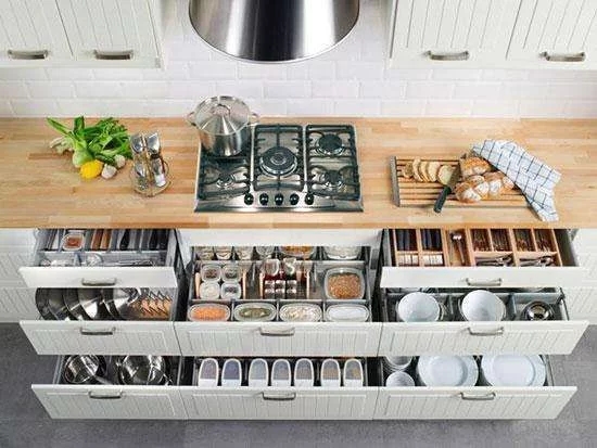 這里建議采用抽屜式的收納地柜,設計時考慮放置物品的的大小設置抽屜的高度和深度,一般從上至下進行遞增,將物品豎起來,再用收納架隔離不同的鍋碗,拉開抽屜,所有的物品一目了然。