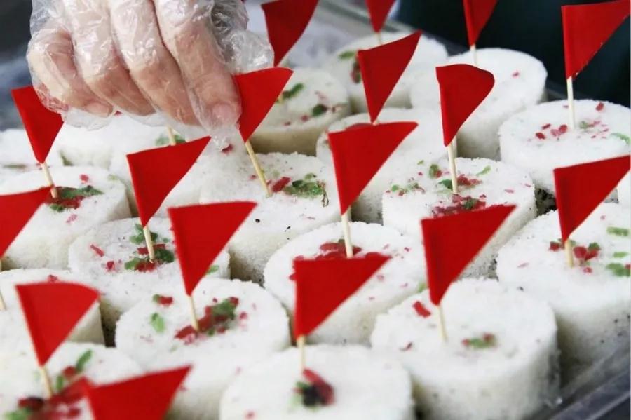 重陽糕又稱花糕、菊糕、五色糕,制作起來較為隨意,沒有特定的制作之法。在古代有“糙花糕”、“細花糕”和“金錢花糕”之分,粘上香菜葉,中間夾上青果、小棗、核桃仁之類的糙干果的糕點稱為糙花糕;有兩層、三層不等,每層中夾有較細的蜜餞干果,如蘋果脯、桃浦烏棗的糕點稱為細花糕;金錢花糕與細花糕相同,只因其如金錢一般大小而稱為金錢花糕,多是上層貴族才能吃到的食品。