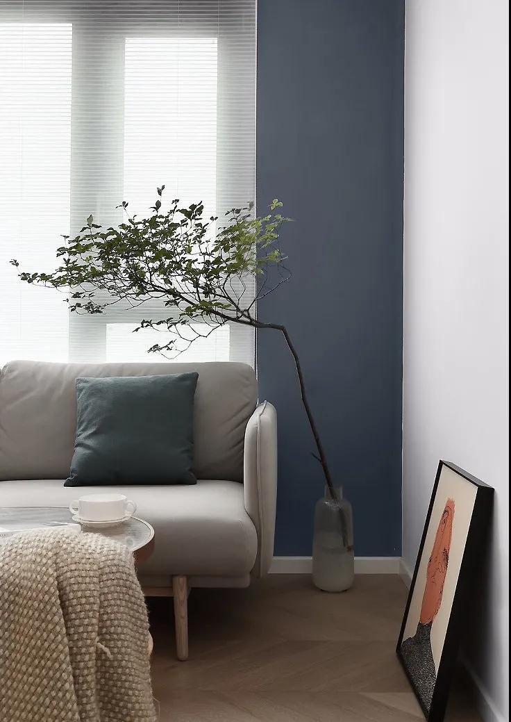 L型掛墻電視柜與白色乳膠漆墻面搭配簡單而不失格調,藍灰色沙發背景墻是空間色彩的點綴,搭配素凈的白色百葉窗簾,不需要過多的前面裝飾,便能給人輕盈而靈動的質感。