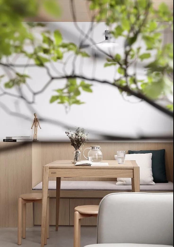 餐廳卡座做成開門式收納柜,鋪上軟墊與抱枕,提高坐感的舒適度,搭配簡單的原木色系木質餐桌,打造溫馨質樸的就餐環境。