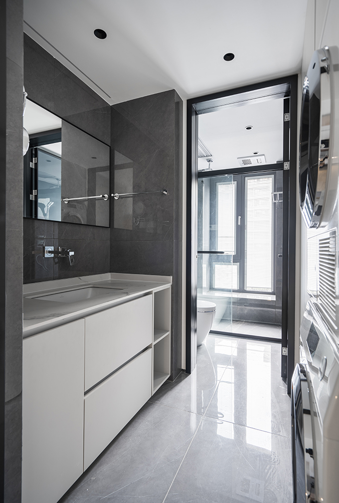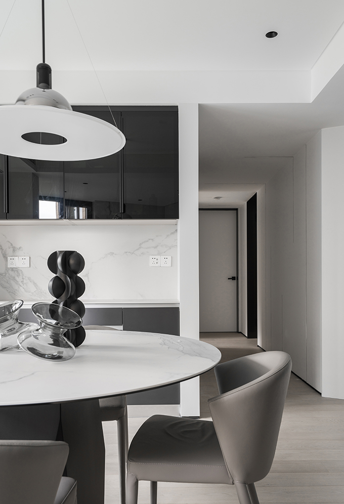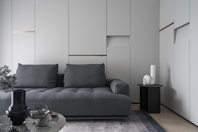 細節(jié)上,大面積的留白,搭配高級灰軟裝,豐富的材質(zhì)和極簡的造型,賦予空間高級質(zhì)感;極具未來感的線性燈光則為極簡家披上華服,其間的精致與溫馨,創(chuàng)造出無限愉悅與驚喜。