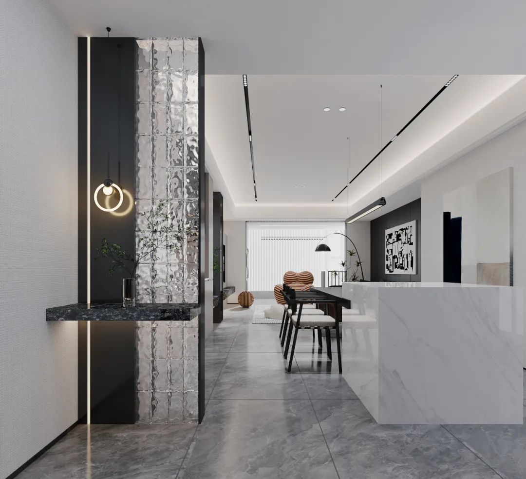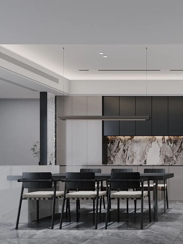 開放式餐廳,由白色吧臺黑色餐桌構成,用餐之余,可與朋友在吧臺上飲茶做樂,餐廳旁柜子臺面為大理石紋理增添了一抹奢華感,整體空間雖不繁復,但每個細節都經過精心布置,展現出高品質的設計感。