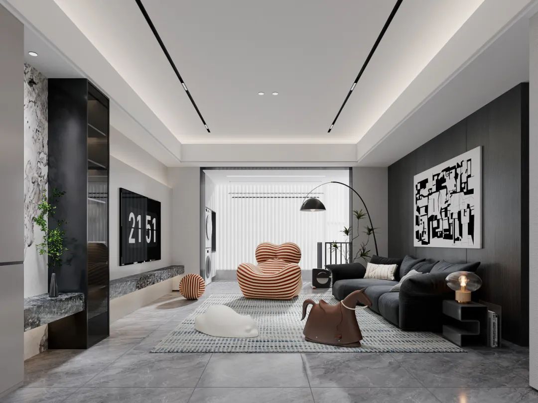 灰色大理石地板與深灰色墻面,構成了沉穩的基調,家具以黑色為主,搭配橙色條紋抱枕,既保持了整體的簡潔性,又增添了活力與亮點,空間布局合理,家具擺放緊湊而不擁擠,營造出寬敞舒適的氛圍。