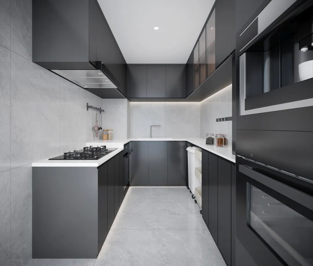 U型布局廚房,功能劃分合理,電器設備如烤箱、爐灶、微波爐等嵌入式設計,可節省空間同時提高使用效率。