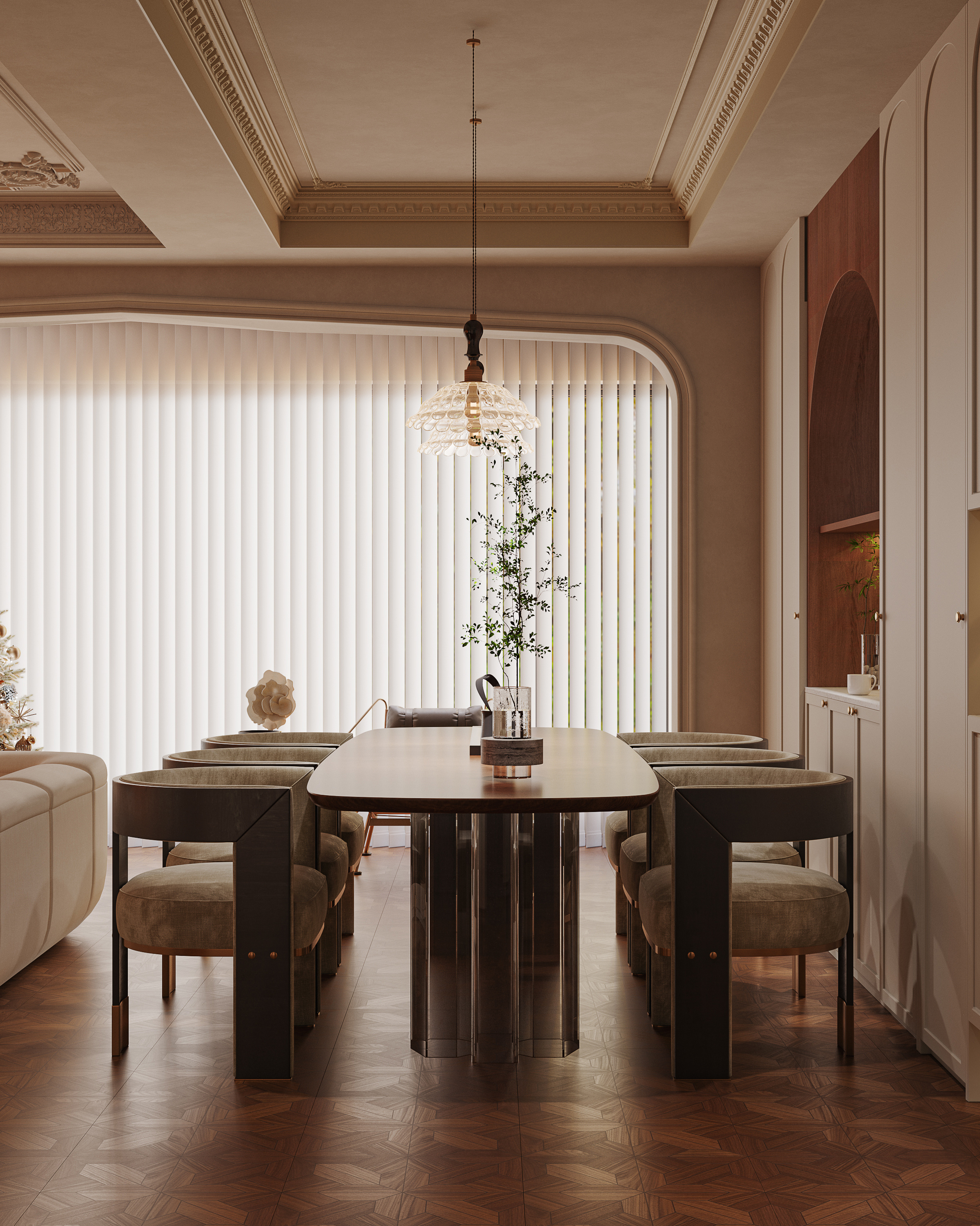 客廳與陽臺用拱形門相連,線條柔美而優雅,讓室外的光線與景致自然過渡至室內,營造出一種溫馨而浪漫的氛圍。