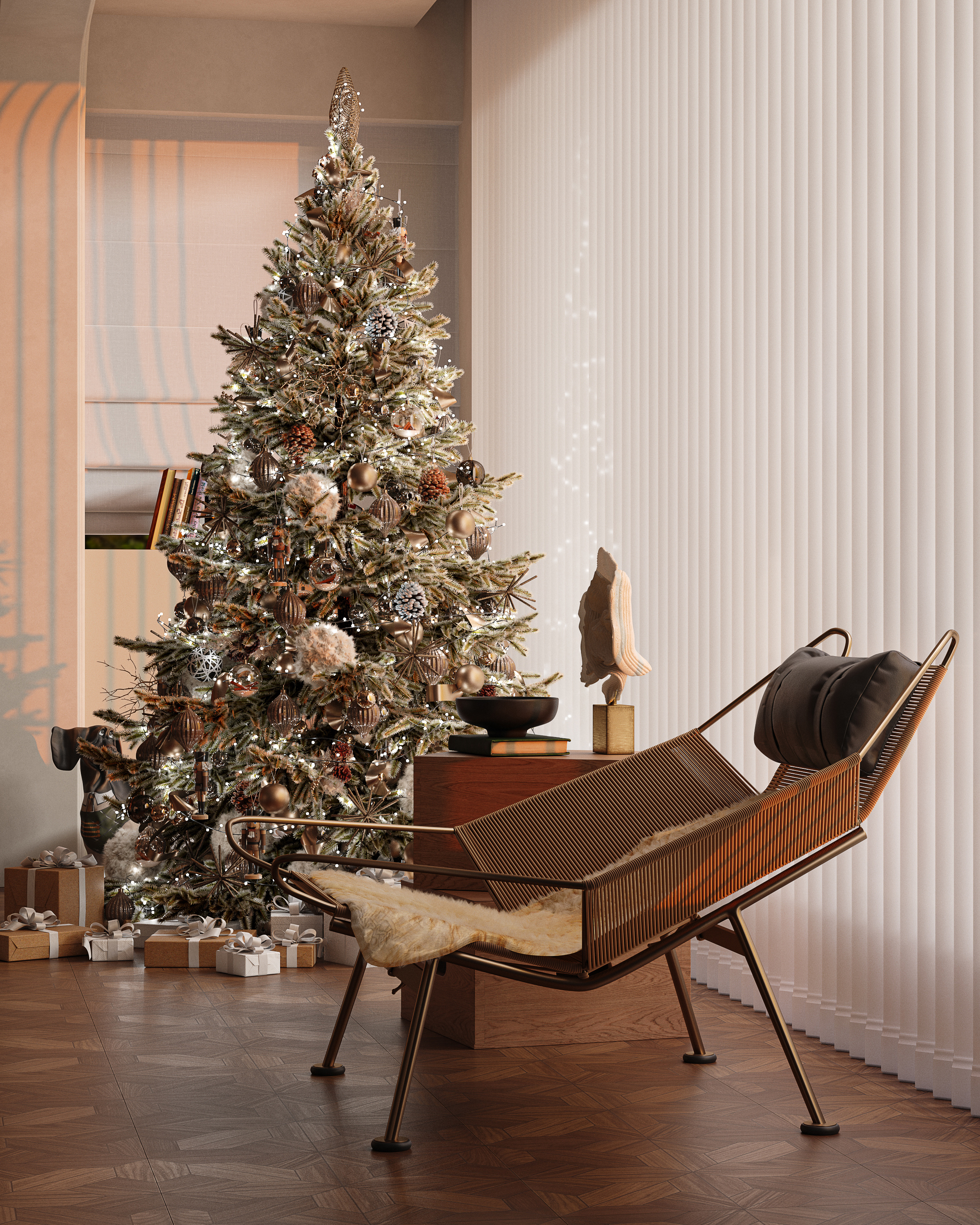 整個空間以米色和棕色為主色調,米色作為主墻色和家具的基色,棕色則通過木質家具、地板以及裝飾品中的點綴,這兩種顏色相互交織,整體設計更加飽滿且富有層次感。