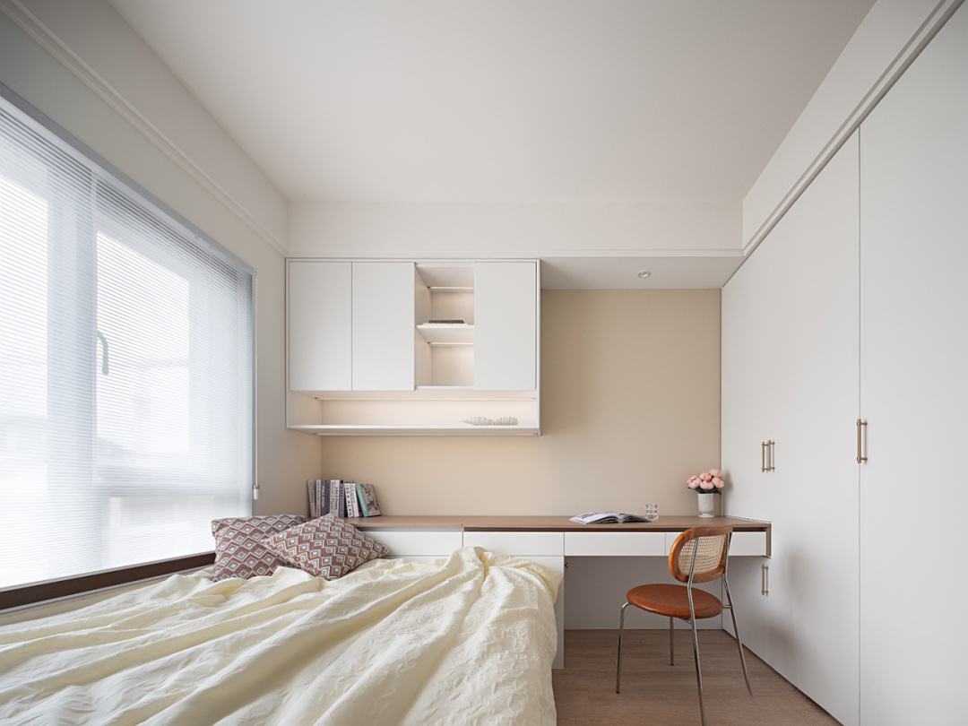 白色與米色的主色調奠定了空間的基調。大窗戶的設計不僅確保了室內充足的自然光線,還使得空間更加明亮通透。床尾巧妙地設置了一個與之相連的書桌區域,使得整個空間得到了高效的利用。