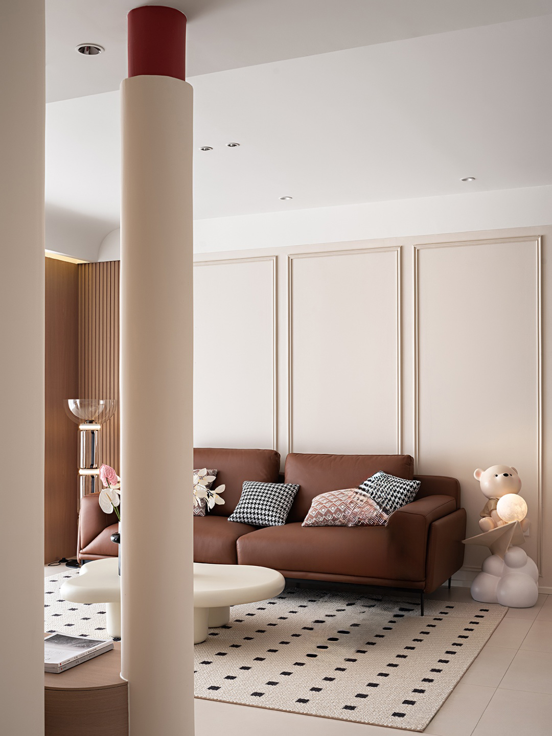 棕色沙發搭配白色茶幾,色彩和諧,營造溫馨氛圍。淺色墻壁與白色地板相映成趣,空間明亮通透。嵌入式燈具點綴天花板,增添光影美感。大理石臺面裝飾獨特,粉色氣球與小熊玩偶增添一抹童真與文藝氣息,整體裝修簡約中透露著不凡品味。
