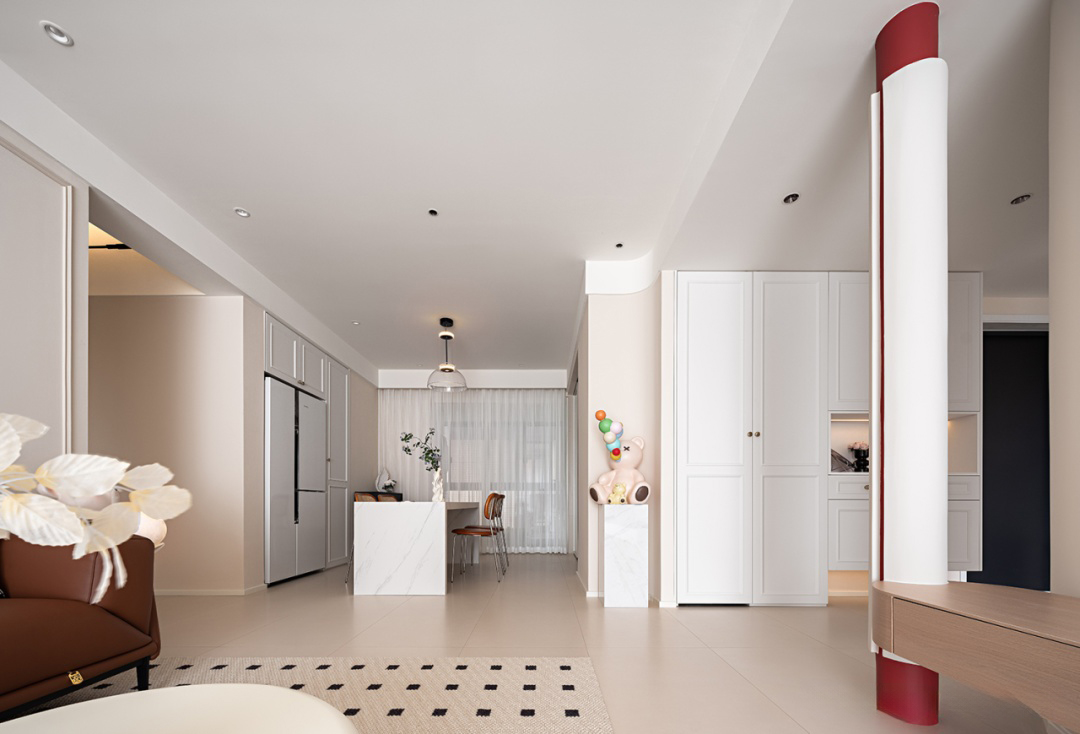 客餐一體,以白色為主色調,營造出明亮寬敞的空間感。大理石材質餐桌設計簡潔實用,搭配木質與金屬材質的椅子,展現材質對比美,桌上精致的花瓶,營造出濃厚的文藝氛圍,整體設計既符合現代審美,又不失溫馨舒適的用餐體驗。