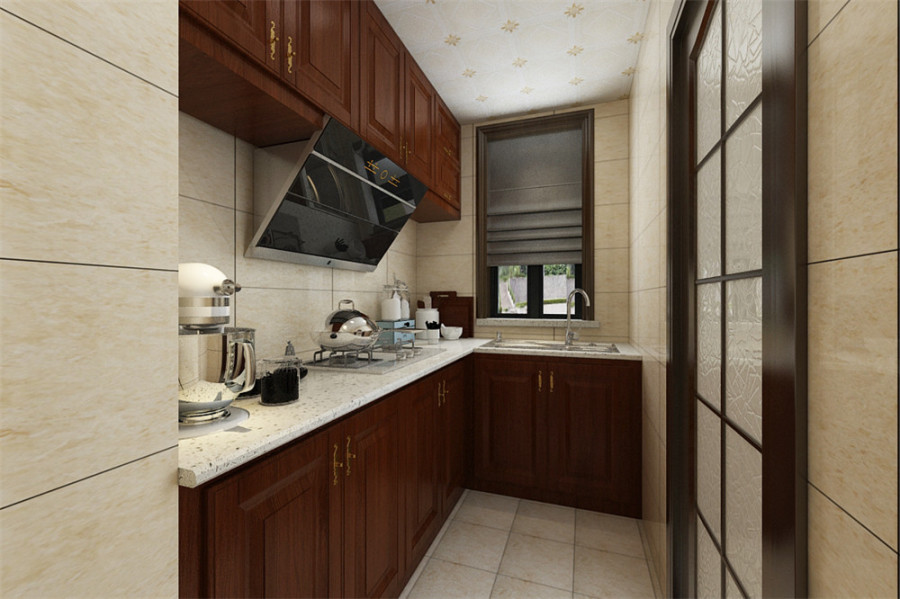 廚房的面積雖然不大,但勝在采光好,所以即使做成了封閉式的也無傷大雅。中式的櫥柜讓廚房也顯得質感十足。