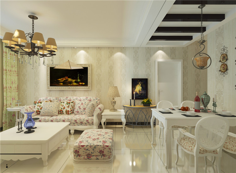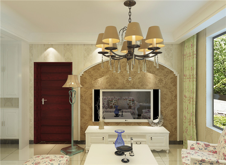 碎花在田園風里是必不可少的元素,設計師在電視背景墻上增添了弧線設計,雖然只是個簡單的小設計,但是卻能增添客廳的層次感。