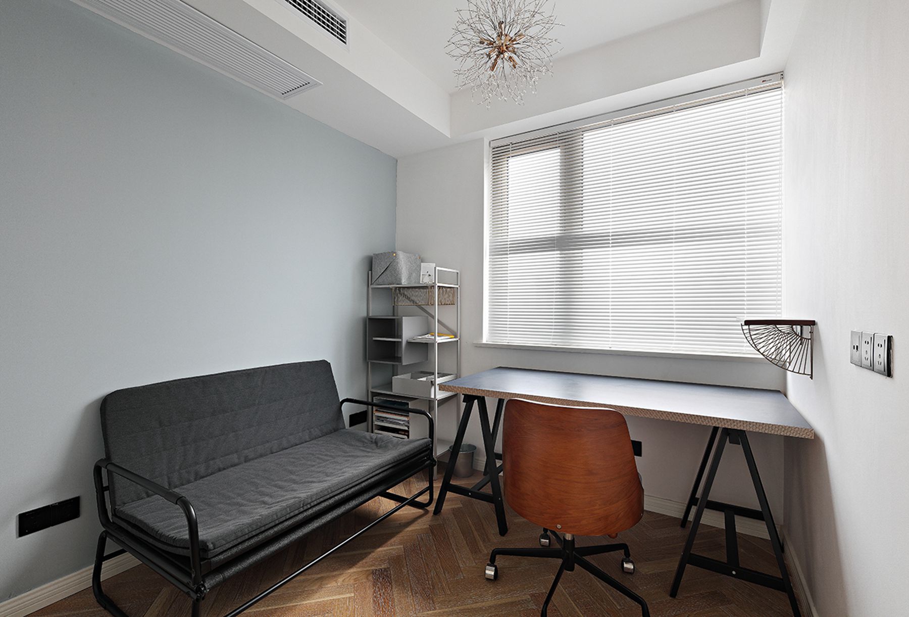 客廳、餐廳和廚房都處于同一個(gè)空間,沒有任何隔斷,所以客廳的光輕而易舉地就能投進(jìn)廚房,照亮餐廳,整個(gè)家也開闊明亮了不少。你一定想不到,客廳的旁邊是一個(gè)小小的書房,雖然沒有設(shè)置書柜,但是平時(shí)可以在這里辦公,玻璃推拉門的設(shè)計(jì)美觀又透亮,完全不用擔(dān)心書房光線不足。