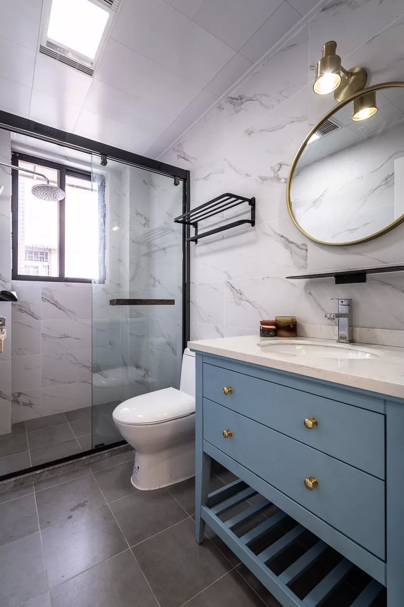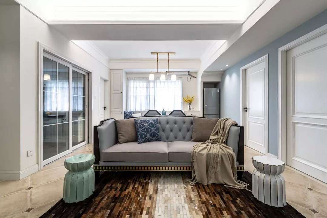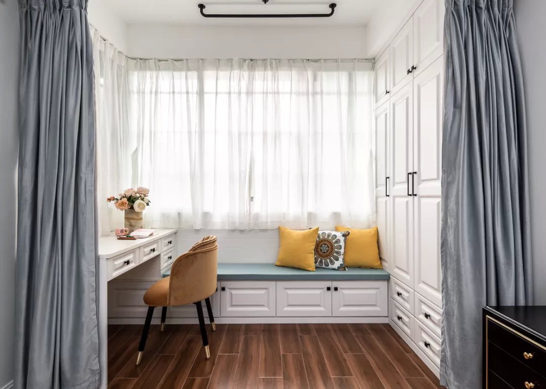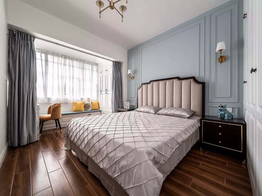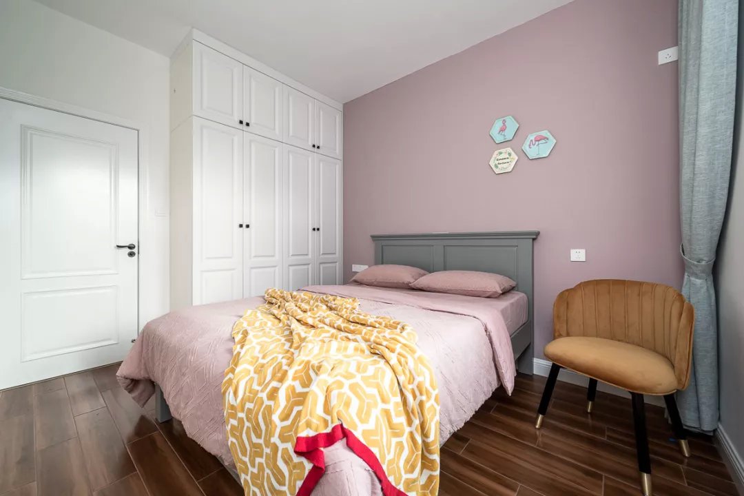 業主夫妻都是白領,都喜歡現代風格的簡單舒適,所以這套二居室的色調都很簡單,木色地板、白色柜子、灰色布藝,另外還有灰調藍色的背景墻,搭配起來和諧又舒適。女兒房的背景墻和床上用品都選用的粉色,是小女孩普遍都能夠接受的清新色調,優雅又活潑。