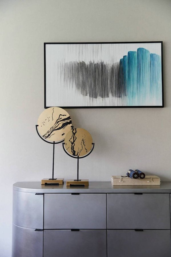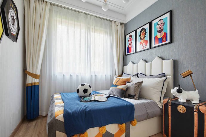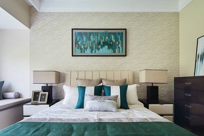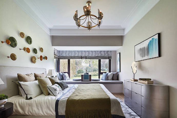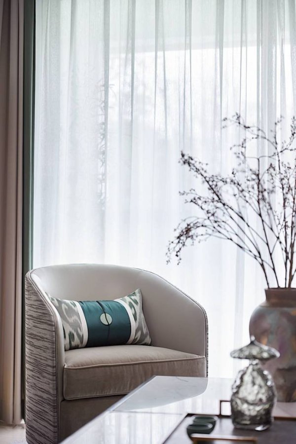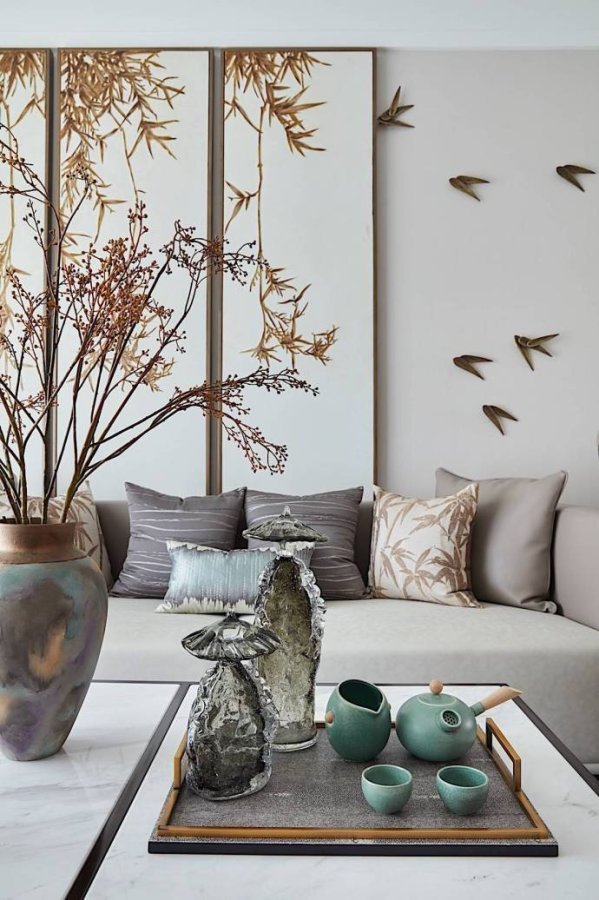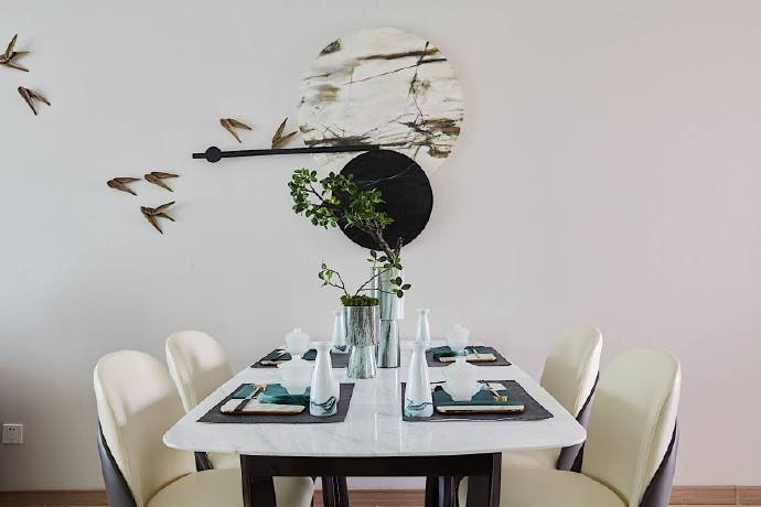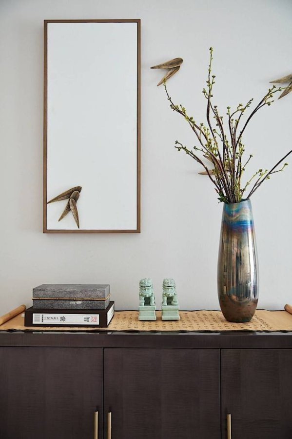 竹子、飛鳥、臘梅,這些元素一結合在一起,你就能很明顯地看出業主的喜好。業主喜歡中國傳統文化,也喜歡中式風格的裝修,但是也要考慮家里妻子和孩子的喜好,所以就有了這樣一套簡單時尚、禪意十足的新中式裝修。如果只用黑白水墨打造中國風,未免太單調,所以設計師加入了一點孔雀藍的色彩,質感十足。