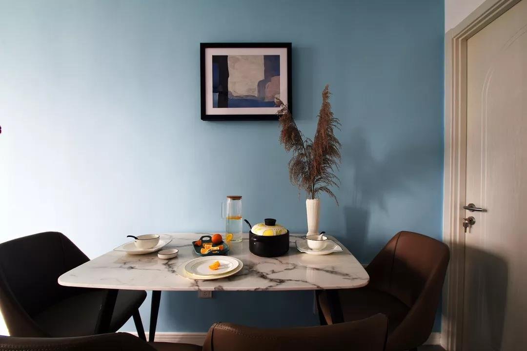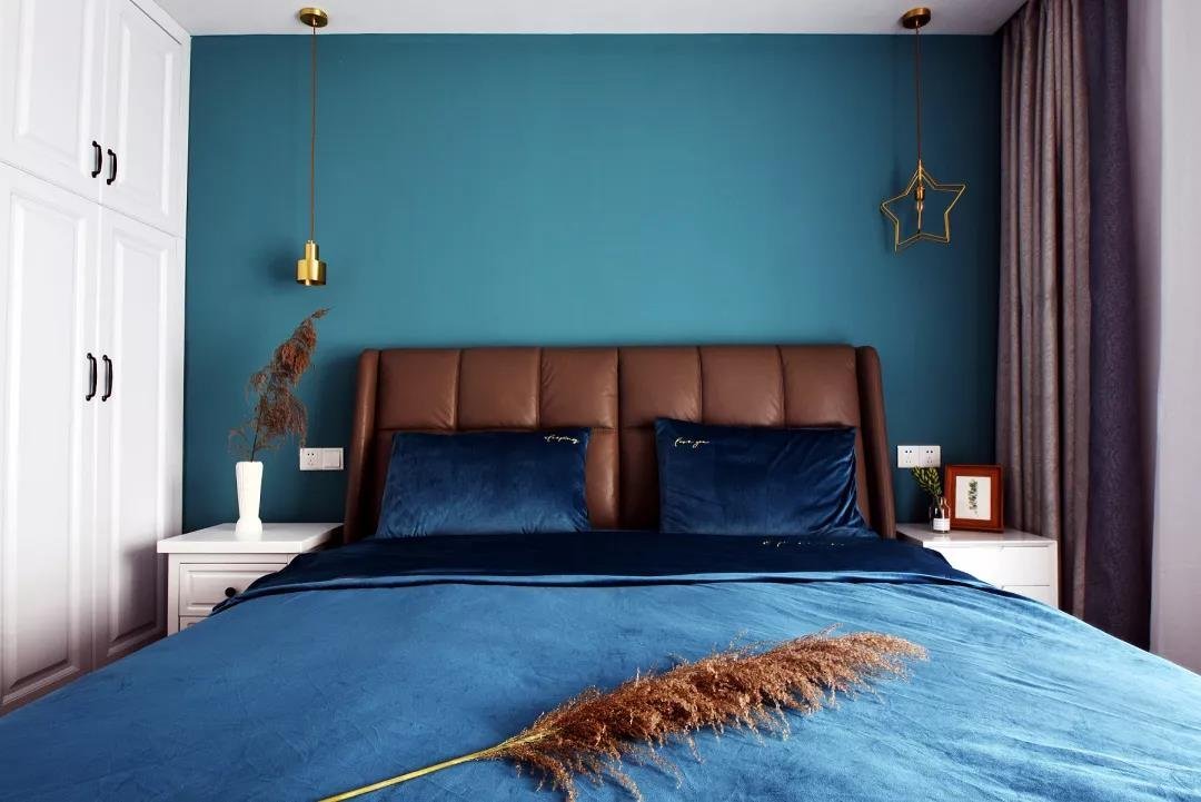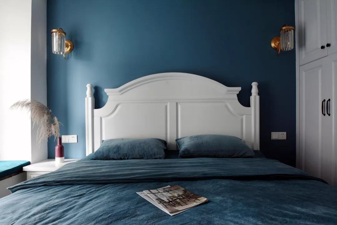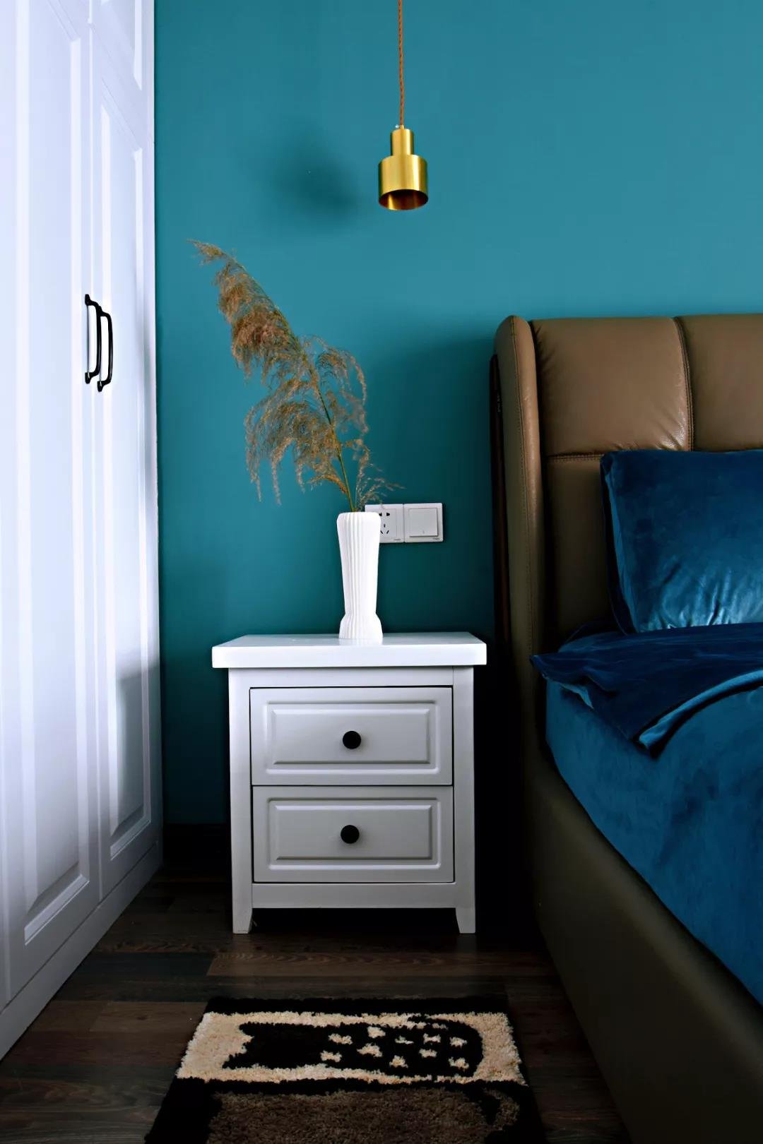 這套簡約風的案例在臥室的配色上,選用了比較少見的深藍色,配以白色的家具,倒彰顯出了別樣的風味。深藍色的裝飾透露著成熟與穩重,同時也不會太過沉悶。客廳還是以淺色系為主,光線從陽臺透進來的時候,整個客廳都很寬敞明亮。