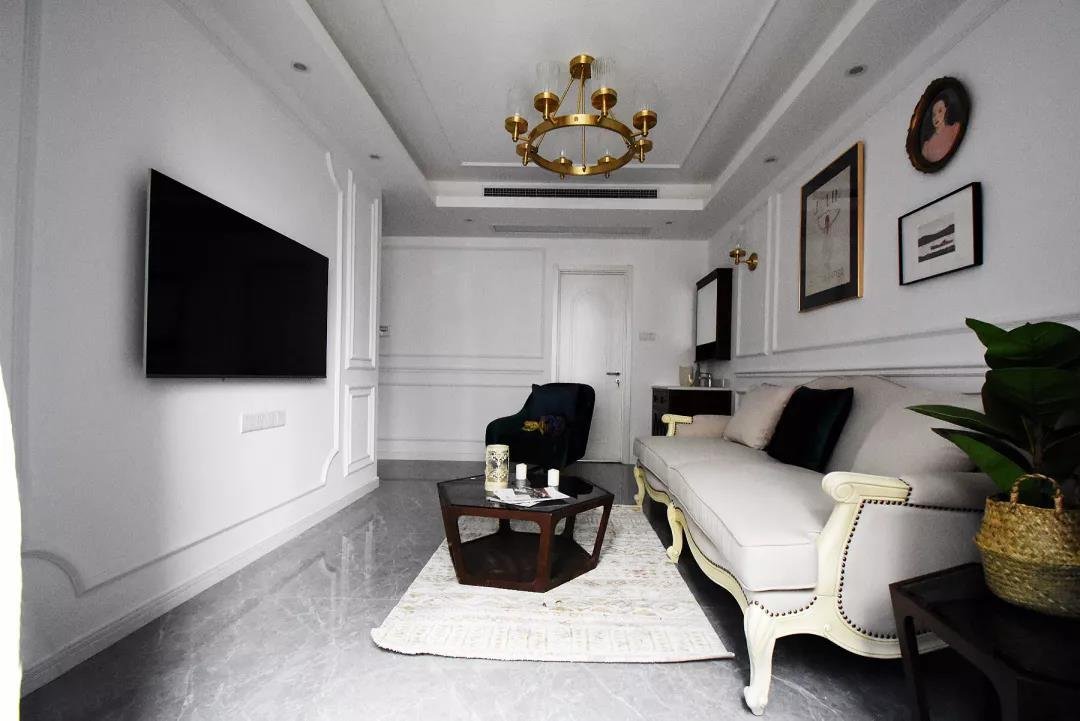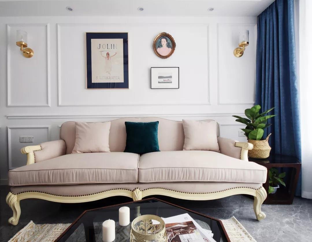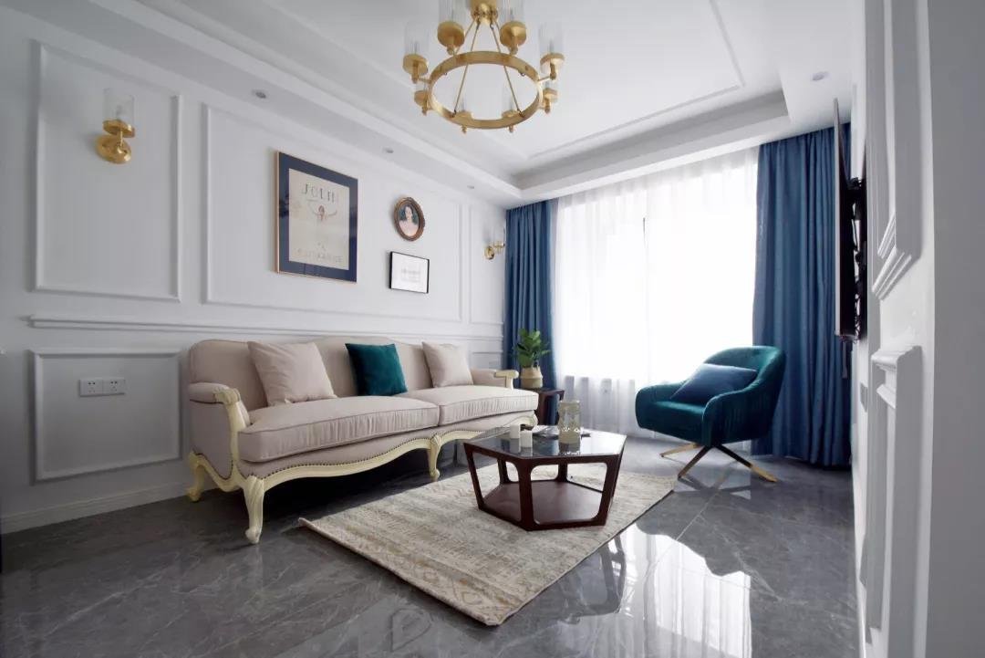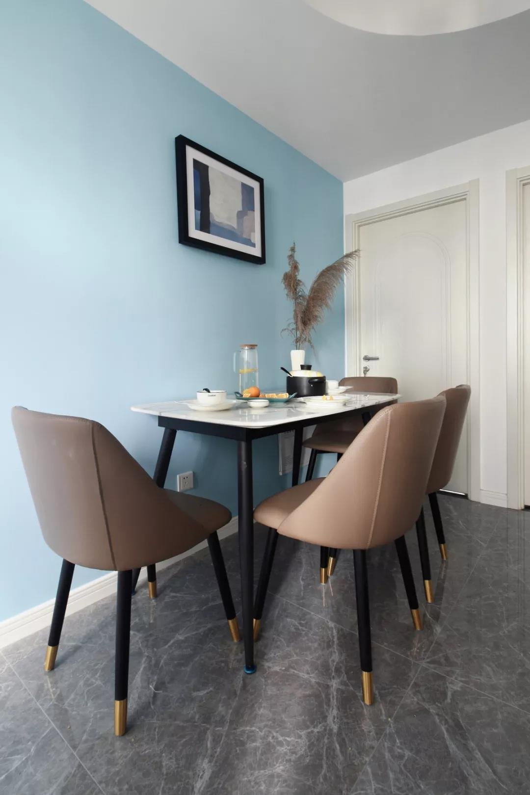 這套簡約風的案例在臥室的配色上,選用了比較少見的深藍色,配以白色的家具,倒彰顯出了別樣的風味。深藍色的裝飾透露著成熟與穩重,同時也不會太過沉悶。客廳還是以淺色系為主,光線從陽臺透進來的時候,整個客廳都很寬敞明亮。