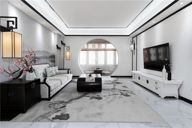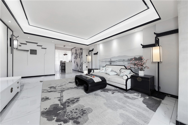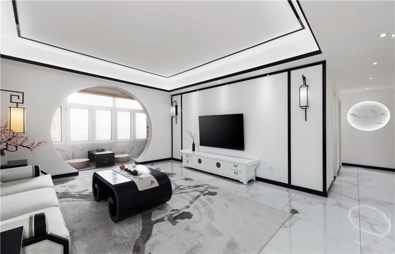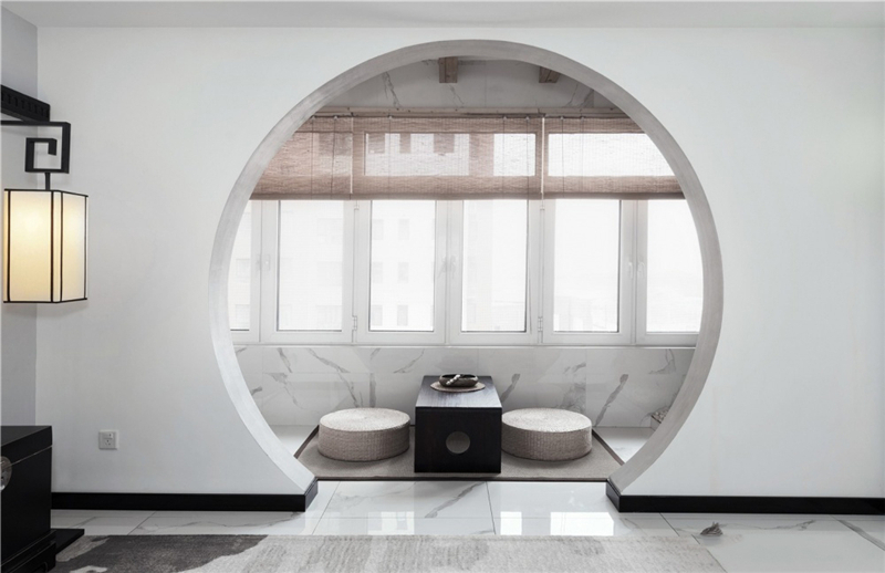 這套新中式風(fēng)格讓原本面積就大的戶(hù)型,變得更為寬敞明亮,陽(yáng)臺(tái)和客廳之間,用景墻做隔斷,就像是把蘇州園林換了一種方式搬回了家中。雖然整個(gè)房屋的主色調(diào)是最簡(jiǎn)單的白色,但是一點(diǎn)都不會(huì)單調(diào),反而有一種水墨畫(huà)的感覺(jué)。