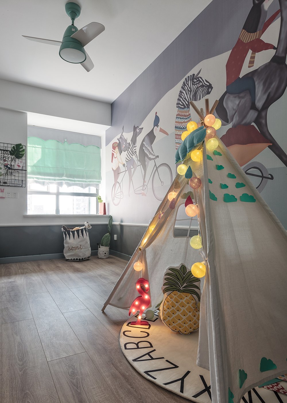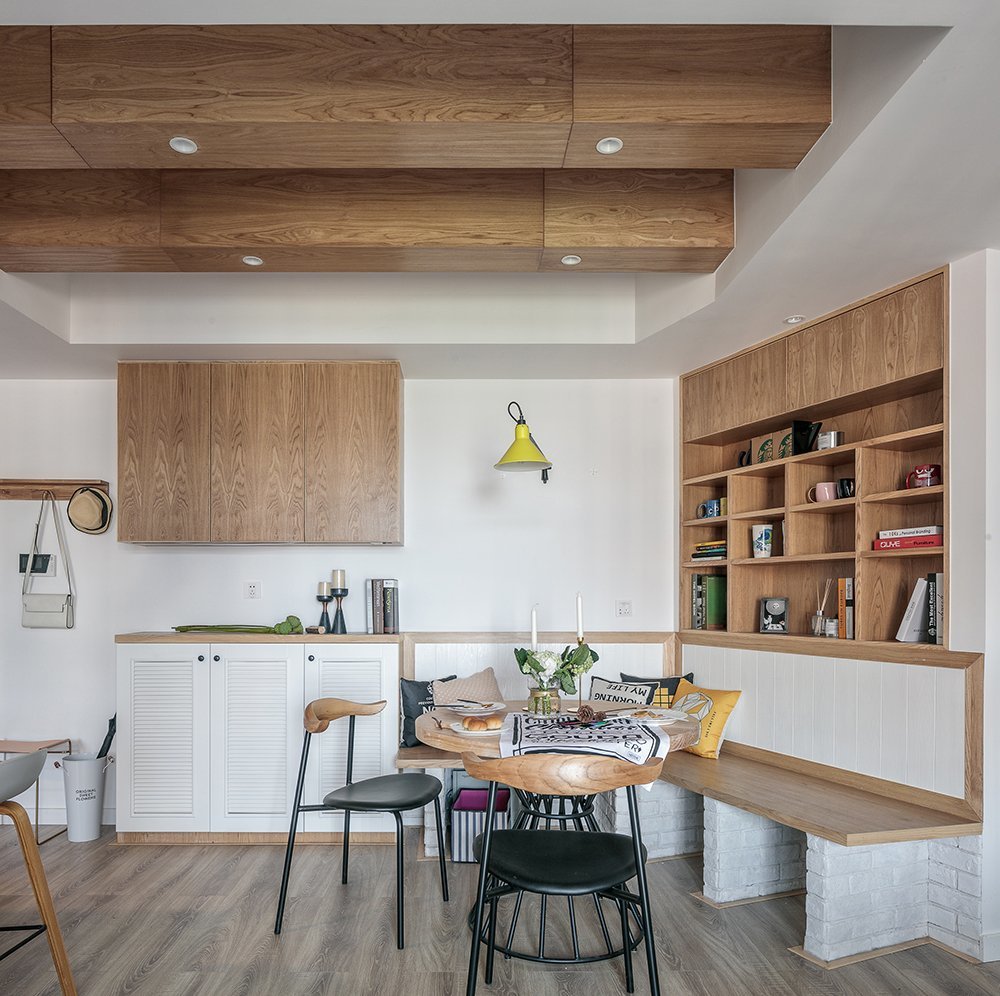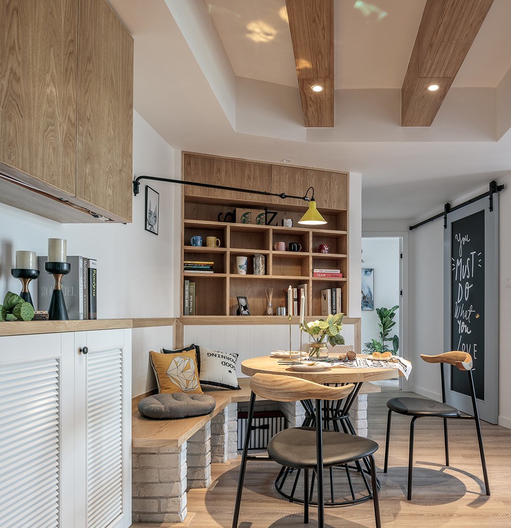 北歐風清新自然,時尚感十足,實用性也很強,加上裝修成本并不算高,所以是很多中小戶型業主在裝修時候的首選。客廳雖小但勝在舒適,餐廳沿著墻面做了個卡座,節省出了更多空間。兒童房趣味性十足,幾乎不擺放家具,讓小朋友能安全玩耍。
