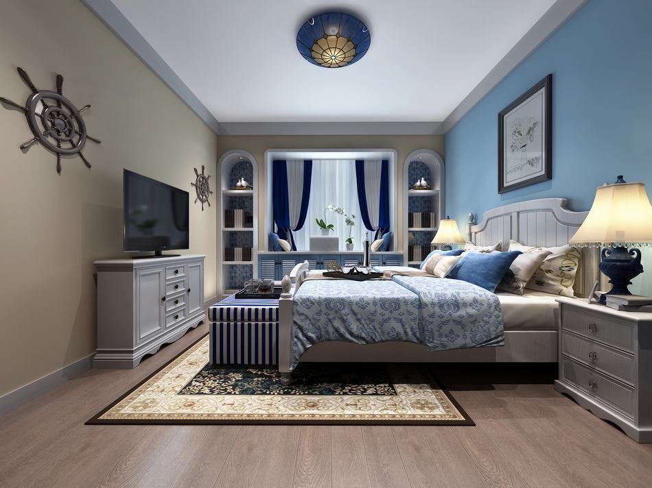 這套地中海風格用深藍色作為客廳背景墻的主色調,配上鐵藝的置物架和吊頂,質感十足。客廳和餐廳用電視背景墻做隔斷,兩個空間互不影響。臥室的墻上安置了兩個船舵做壁飾,有一種航海的感覺。對于喜歡異國風情的業主來說,地中海風格是個不錯的選擇。