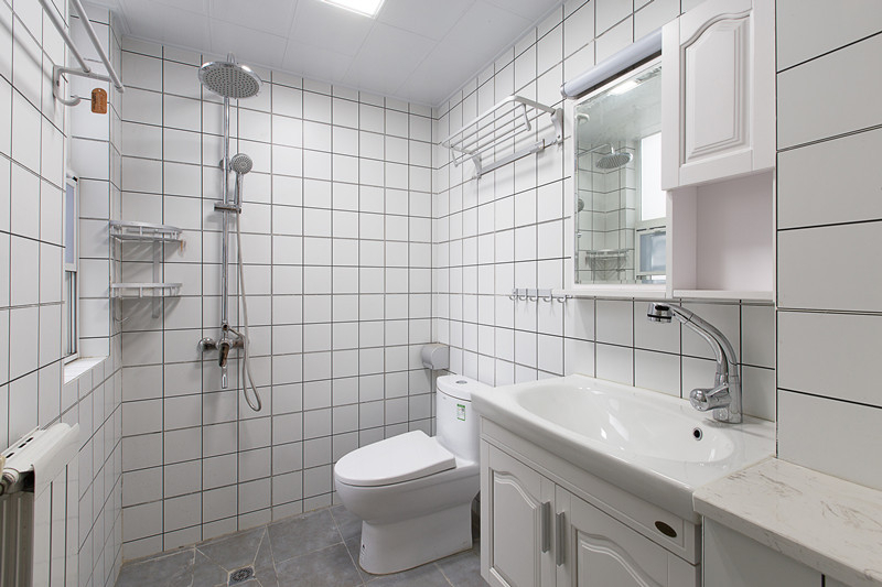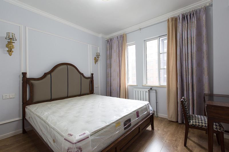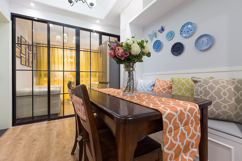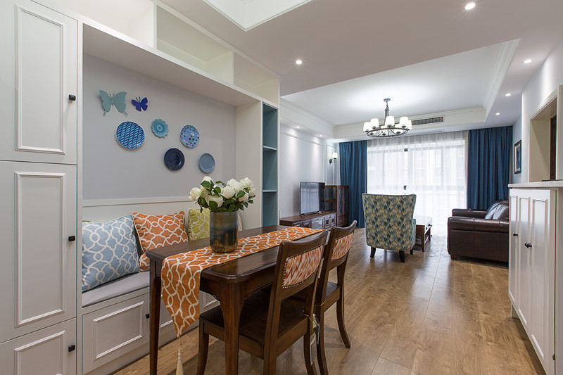 這套美式風格比較小清新,給人一種森林的感覺。客廳寬敞明亮,沙發和茶幾都不是很大,剛好夠用。餐廳使用的桌椅和客廳的家具同屬一套,風格上有一致性,餐桌的一側用一個定制的組合柜,做成了卡座的形式,既增加了儲物空間,也留出了通往廚房的走道。