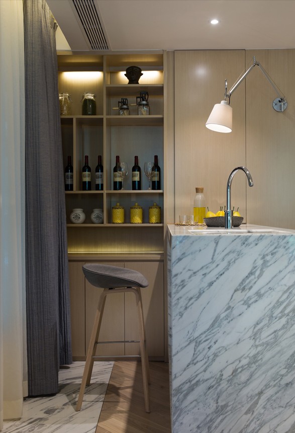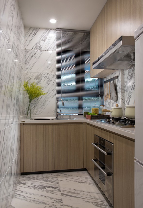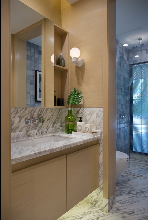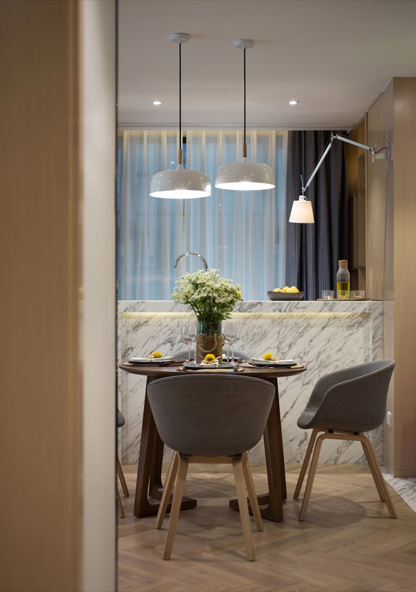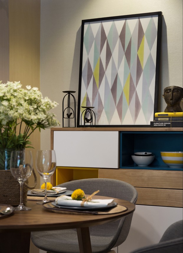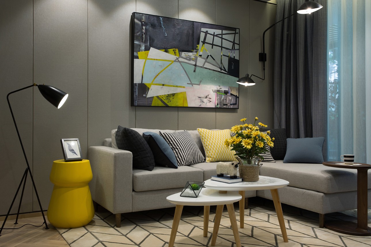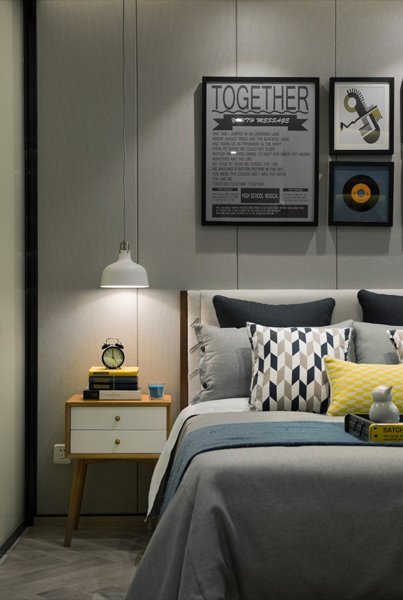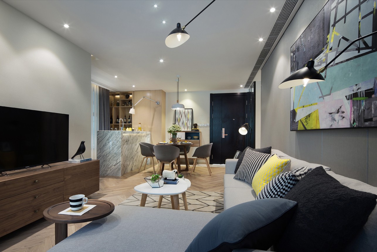 這套現代風格的裝飾很是時尚,不管是壁畫還是擺飾,都是設計師精心挑選過的。客廳的墻面和沙發都是灰色調,但是為了使整個空間看起來不會太單調,設計師用了壁畫和亮色抱枕,去打造一種層次感。衛生間干濕分離,盥洗臺很大,兩個人同時使用也沒問題。