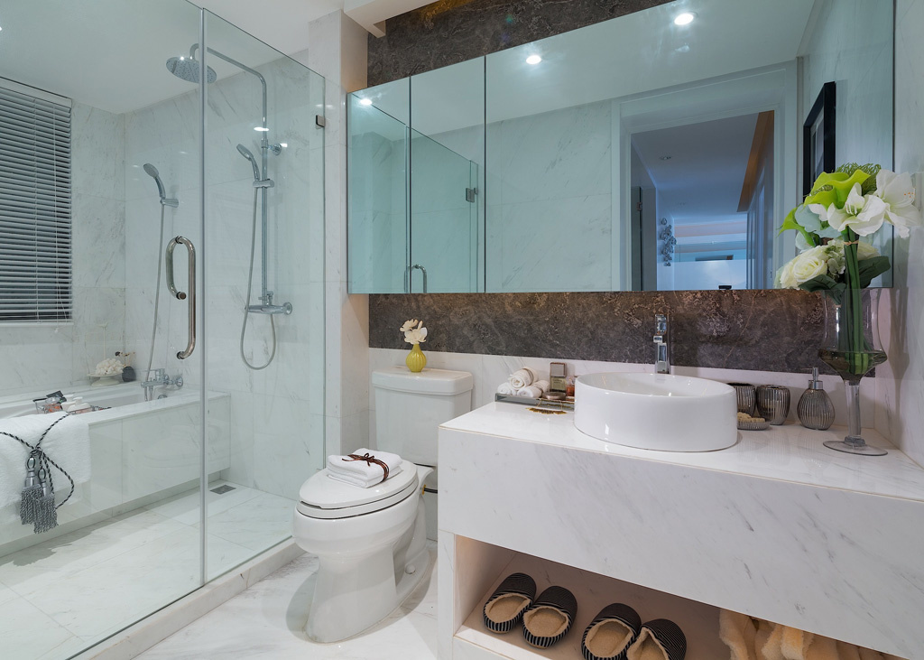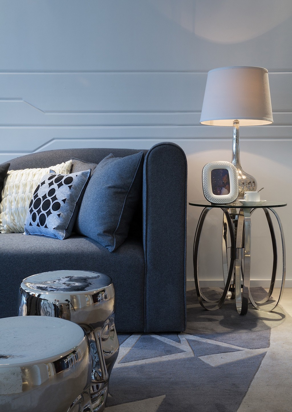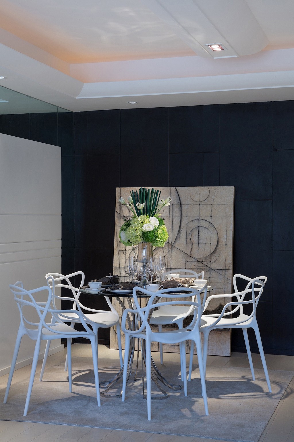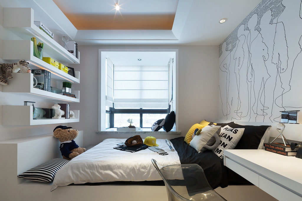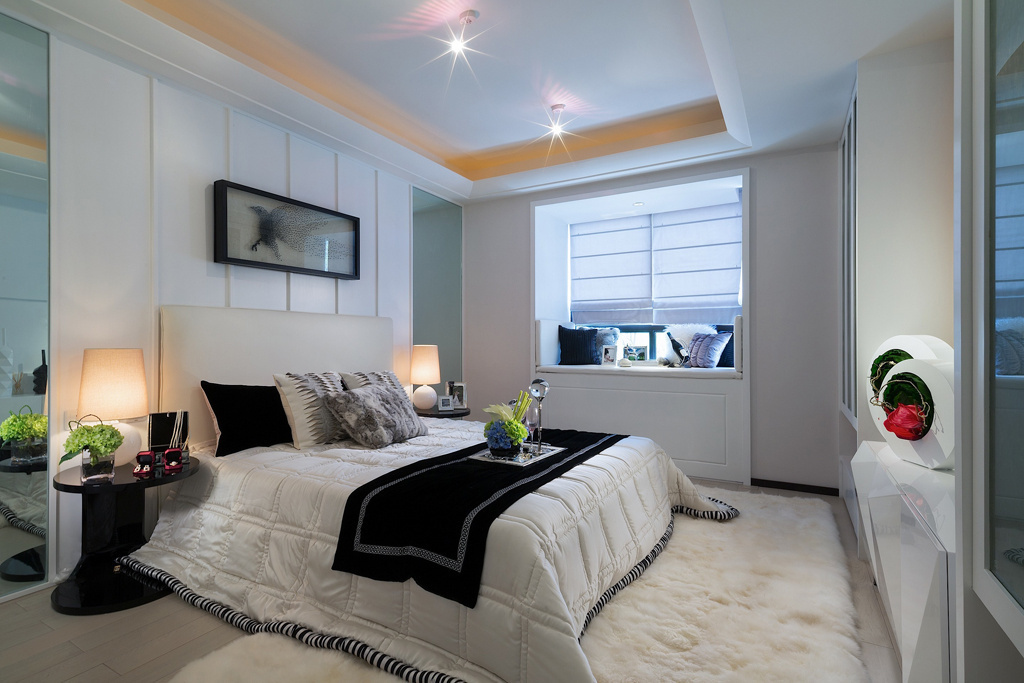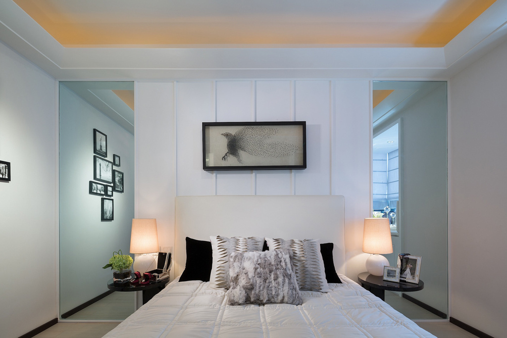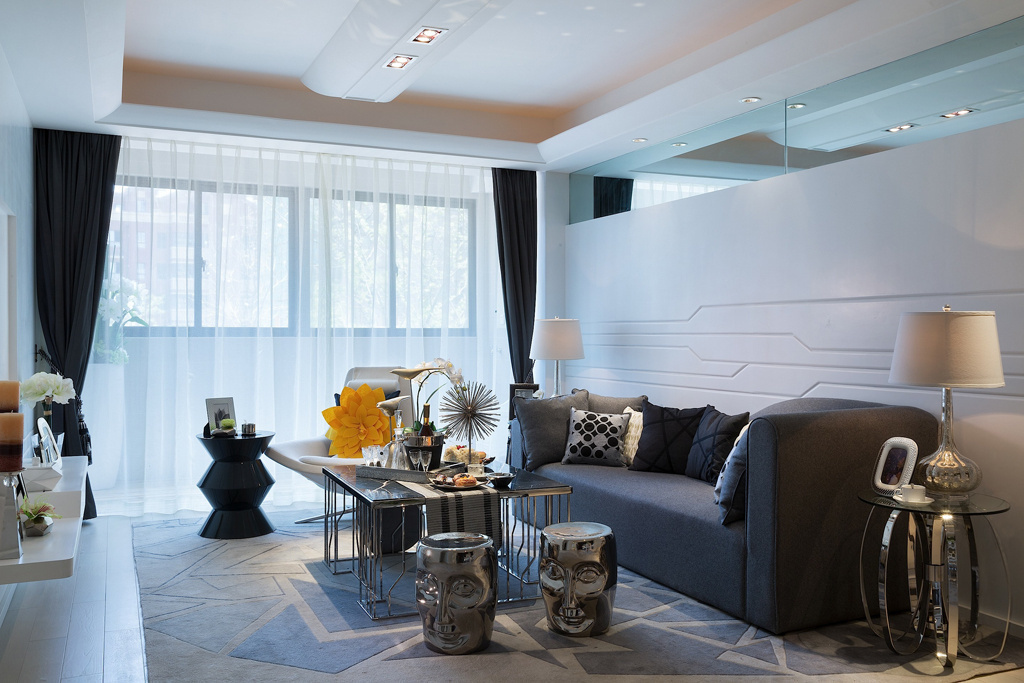 這套后現代風格充滿設計感,細節上有一些叛逆,就像客廳里的小矮凳,并不是所有人都能接受的款式。臥室的風格相對比較簡潔,以白色為主色調,用鏡子和玻璃增加層次感,效果十分不一樣。