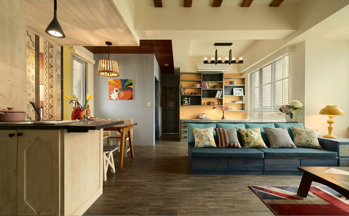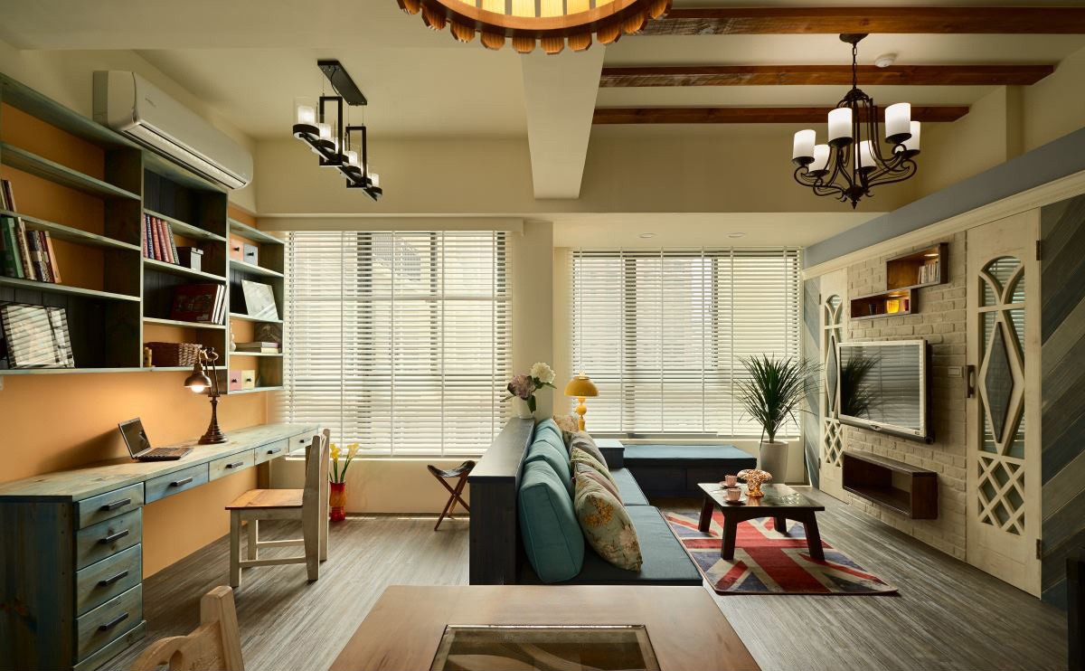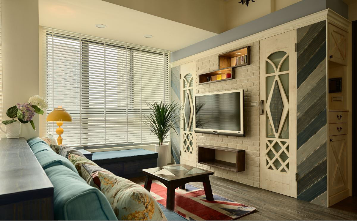 在快節奏的生活里,田園風格是緩和壓力的良藥。下班后推開門,碎花和綠植的裝飾,讓你感覺自己置身于鄉間小屋,暖光的燈光打造溫馨舒適的氛圍。電視背景墻設計感十足,磚瓦的設計復古感滿滿,簡單的展示架可以用來放置一些書籍,很是實用。