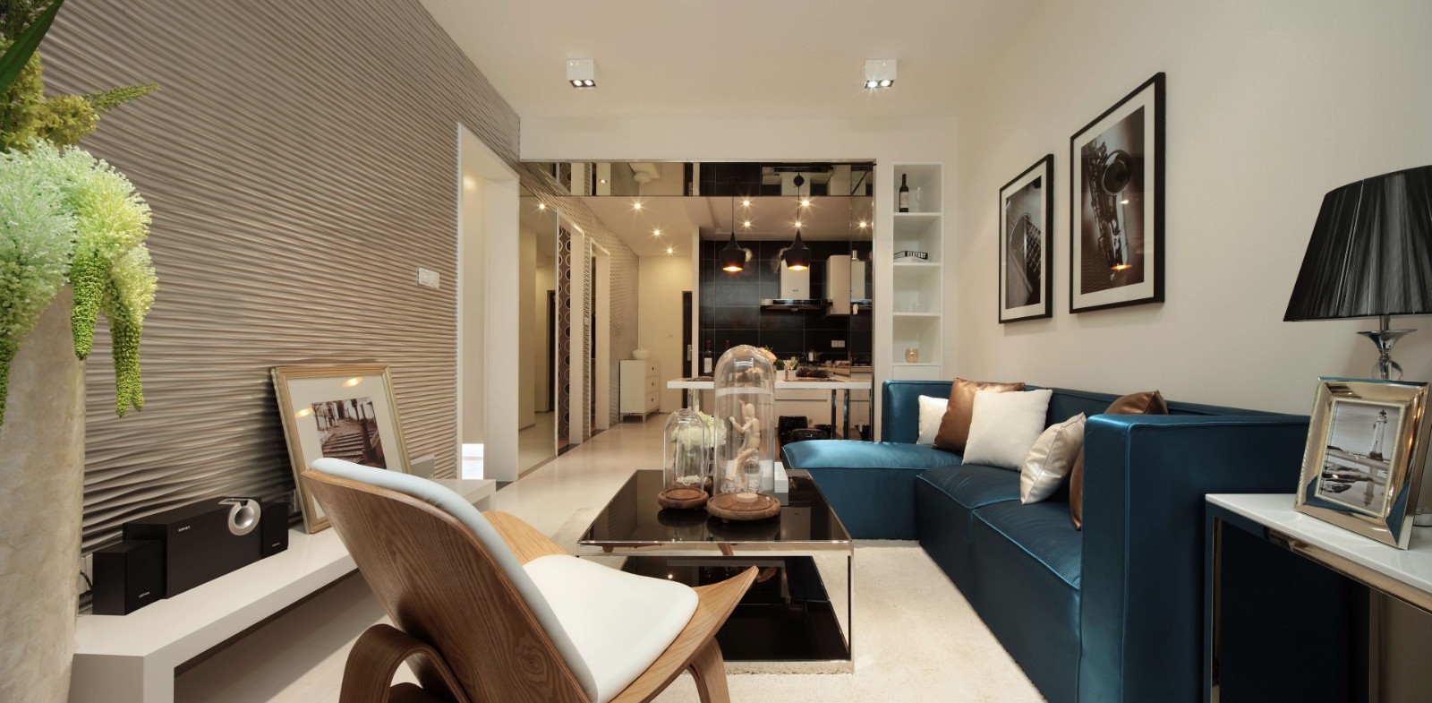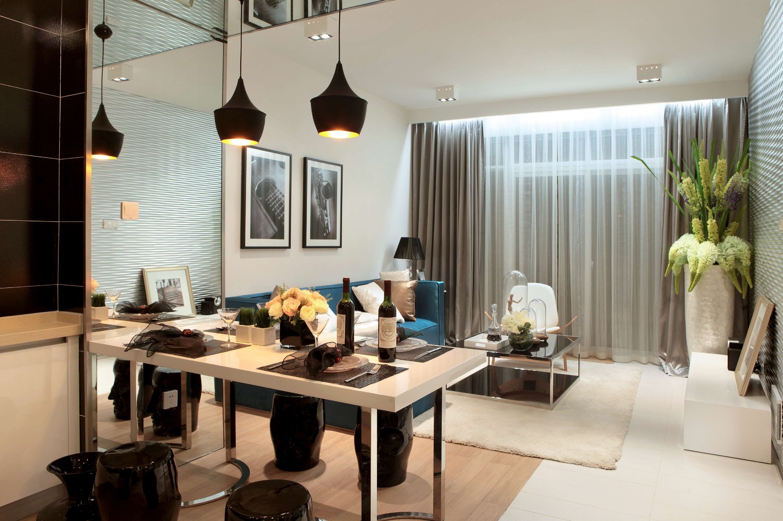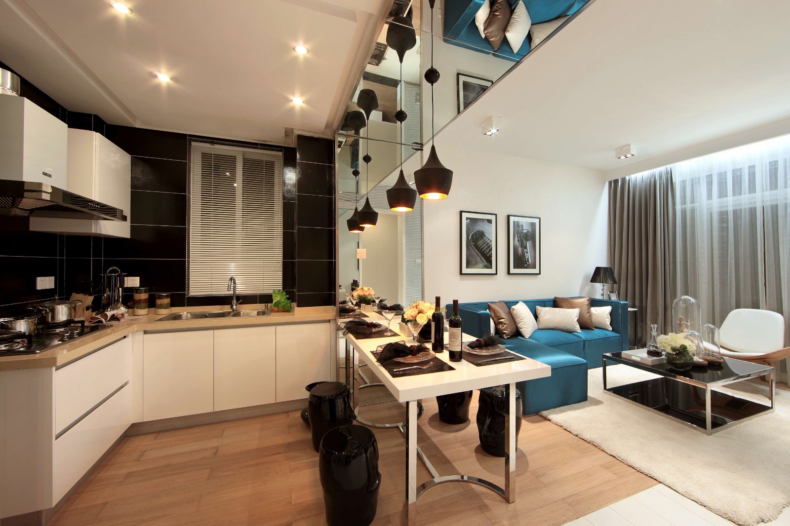 后現代風格追求時尚與新潮,多種元素混搭的效果,打造了 一種統高雅與現代新奇相結合的效果。客廳、餐廳與廚房連為一體,餐廳也相當于是客廳和廚房之間的隔斷。天花板上的鏡子設計,讓整個空間都開闊了不少。