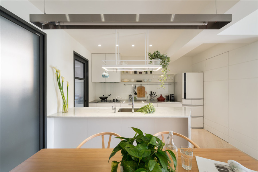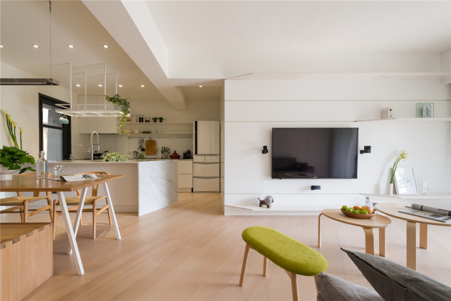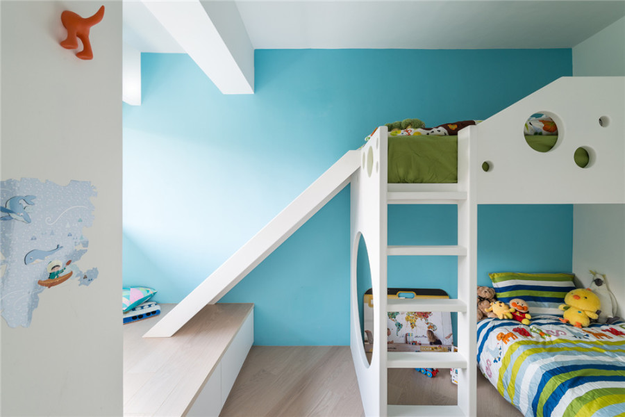 這套日式風格注重打造一種自然的氣息,客廳和餐廳隨處可見綠植,綠色、白色與原木色交相輝映,有一種森林的感覺。兒童房以藍色調為主,組合上下床的形式給兒童房的空間增添了不少趣味性,是小男孩都會喜歡的設計。