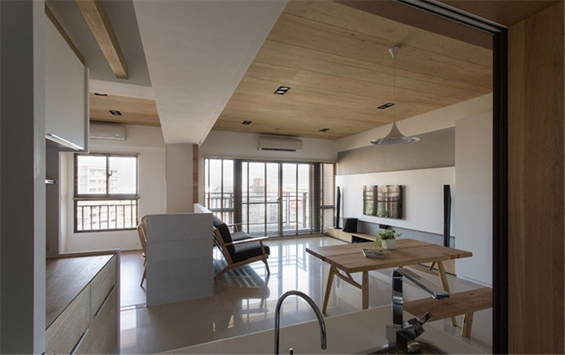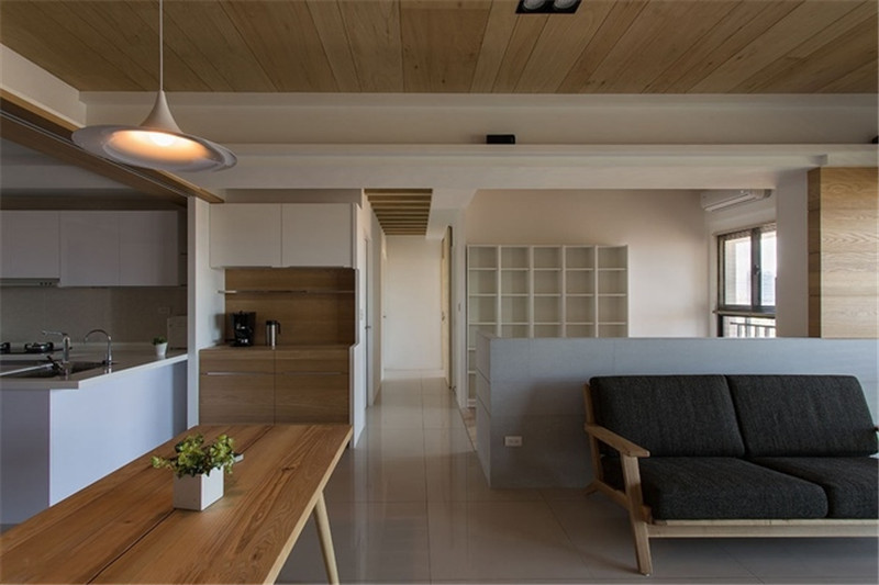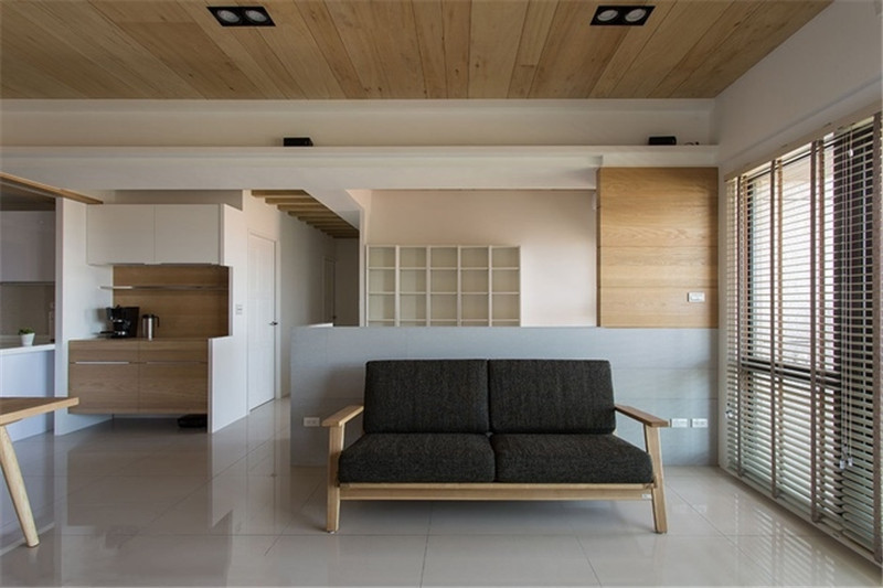 日式極簡風格的魅力在于,用最簡單的排列與組合,打造出最舒適的家居空間。開放式的書房就設置在沙發背后,通透的采光打造出了一個良好的工作環境,因為平時只有業主夫妻倆在家,所以也不擔心會被打擾。