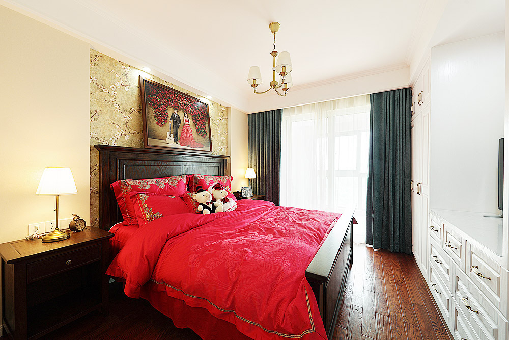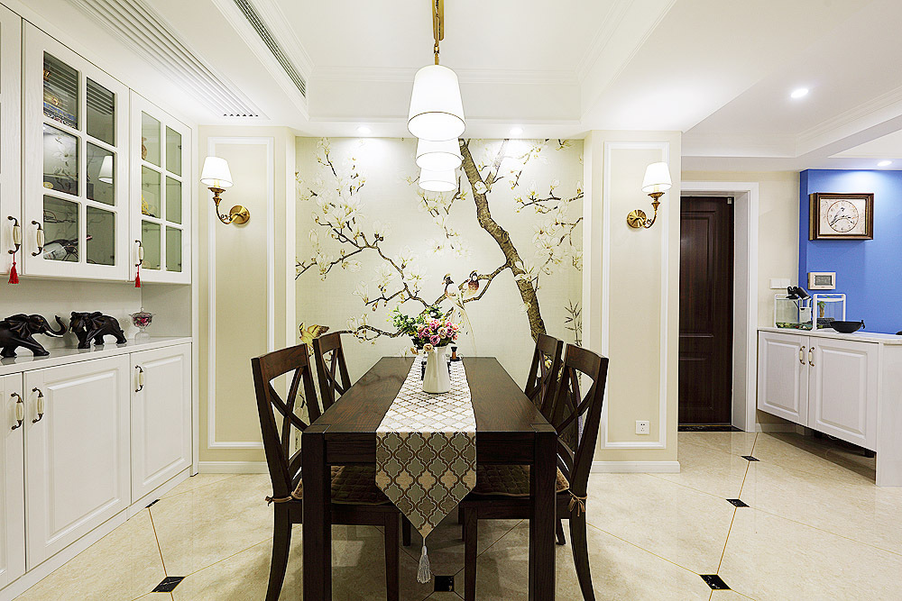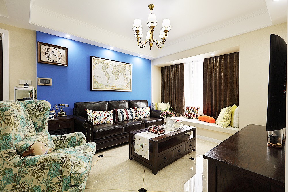 這是一套小夫妻的婚房,為了契合這個喜慶的氛圍,在裝修上自然不能太過冰冷。田園風格一直以來都是婚房裝修的最佳選擇之一,實用為主,美觀性也很強??蛷d的藍色背景墻,無疑是最搶眼的存在,能第一時間就抓住客人的視線。