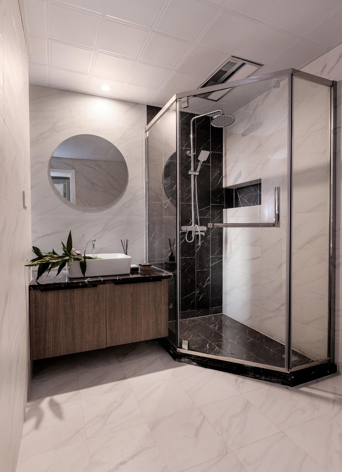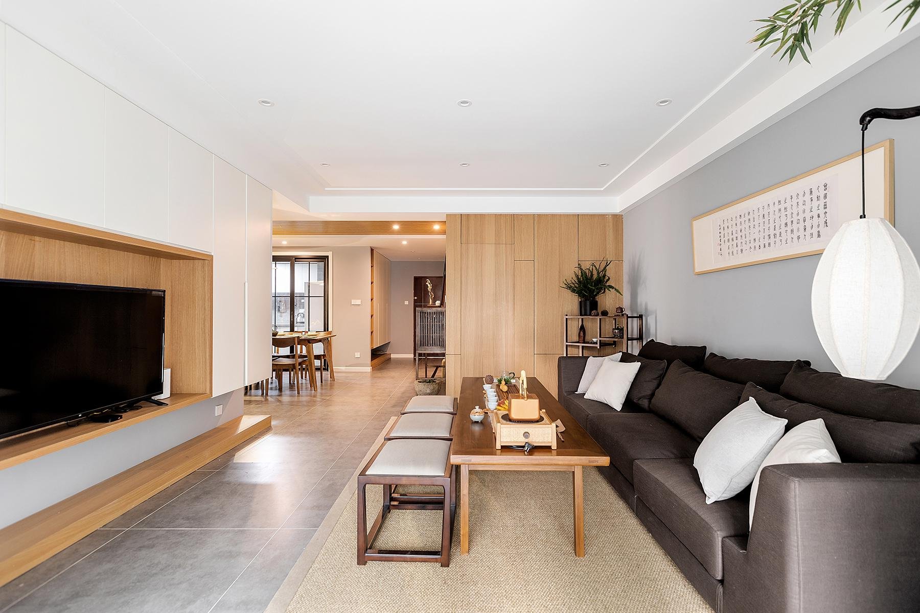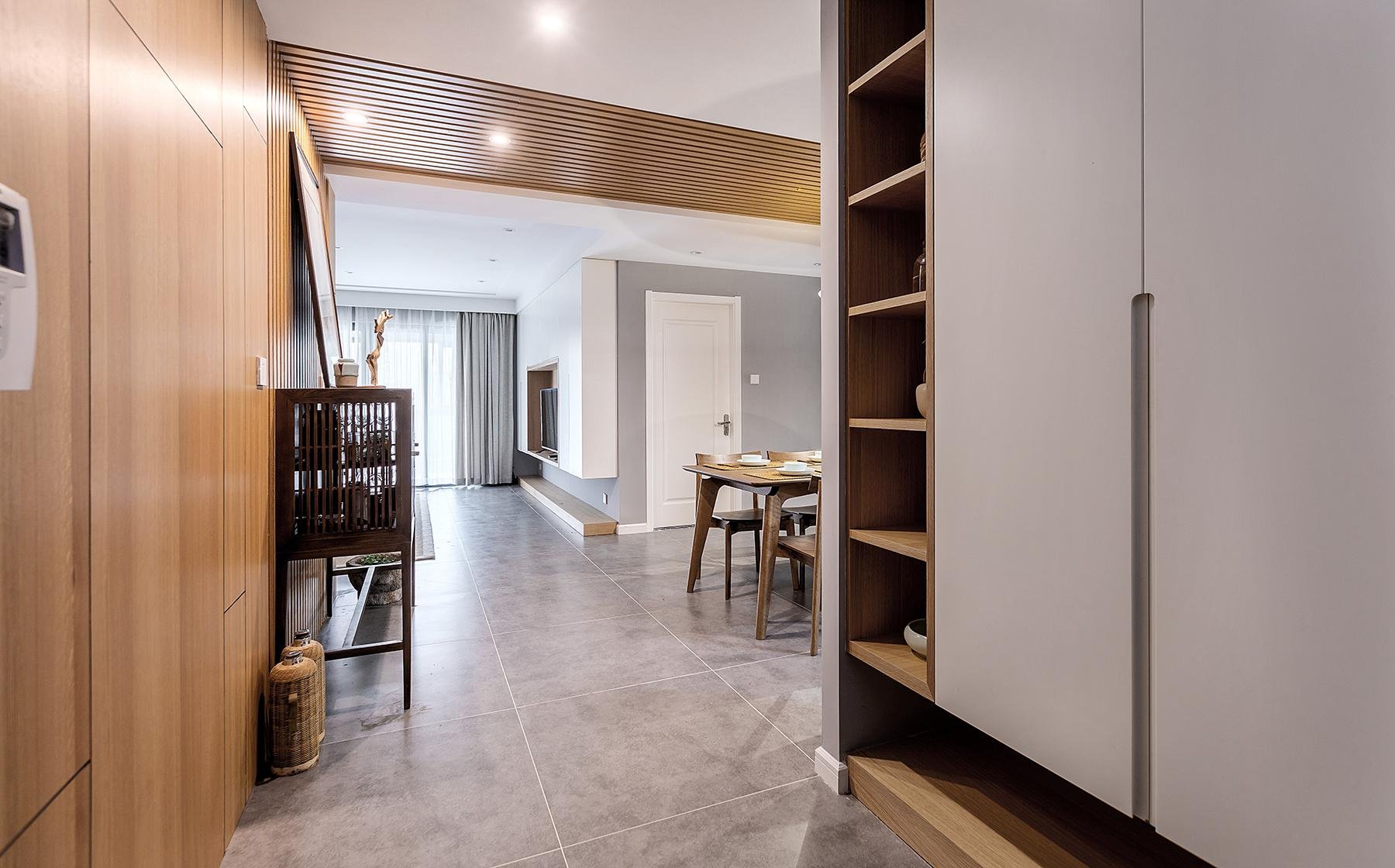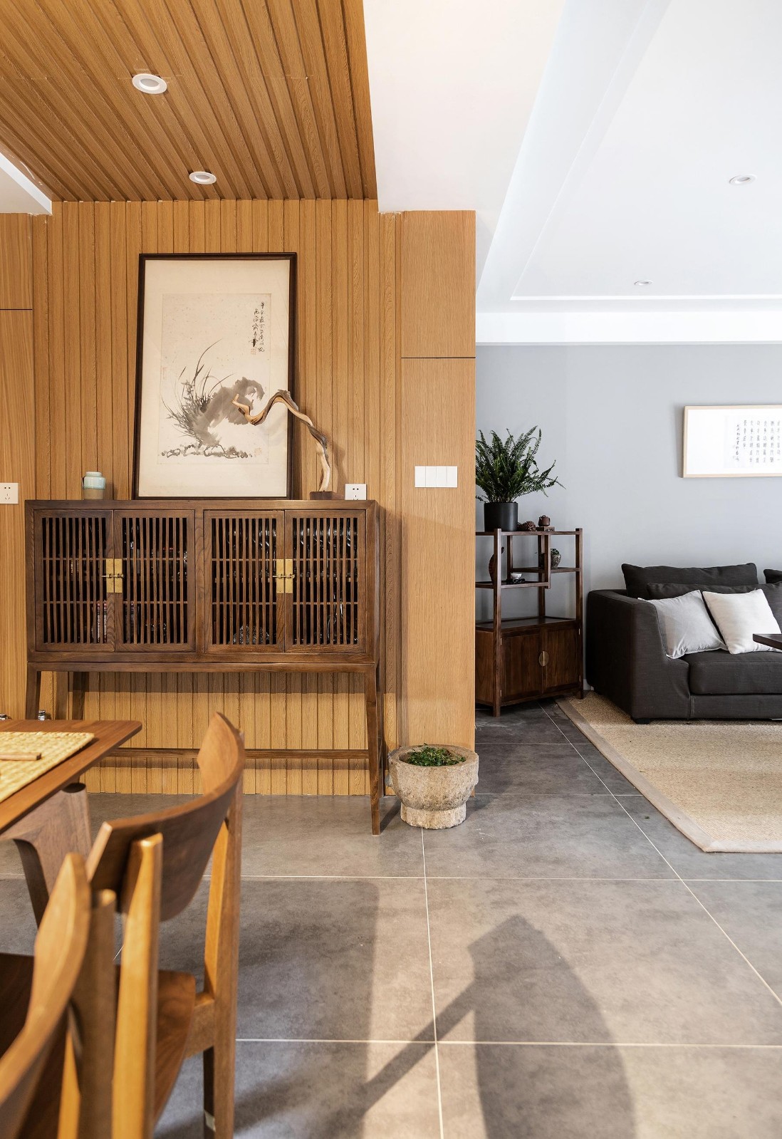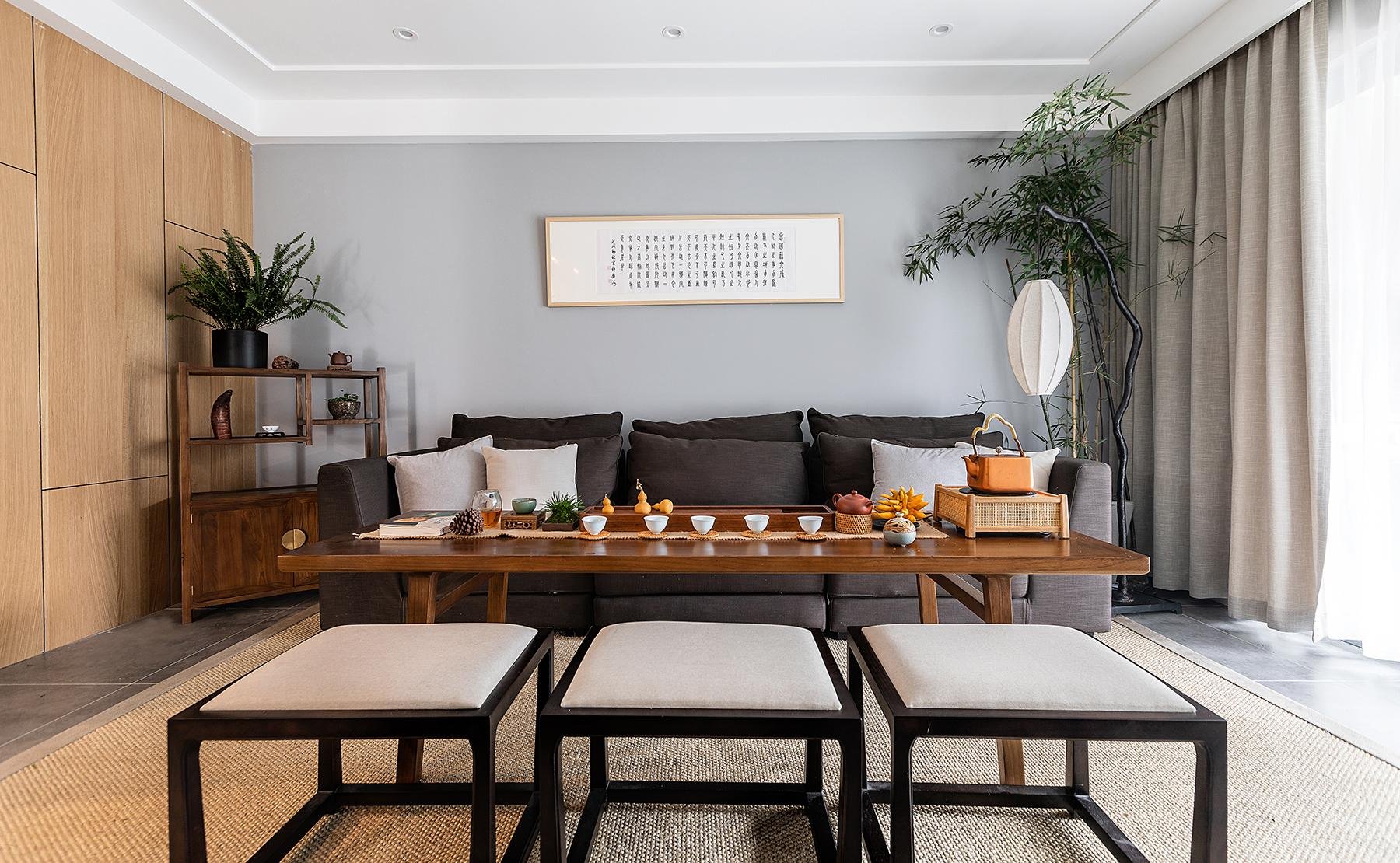 這套新中式風格簡潔實用,同時也有一種中式專屬的高雅在里面。不管是玄關還是客廳,滿滿都是收納空間,不愁沒有地方對方物件。業主平時會叫上三兩好友來家里喝茶,設計師摒棄了傳統茶幾設計,用可以靈活移動的小凳子代替,方便快捷。