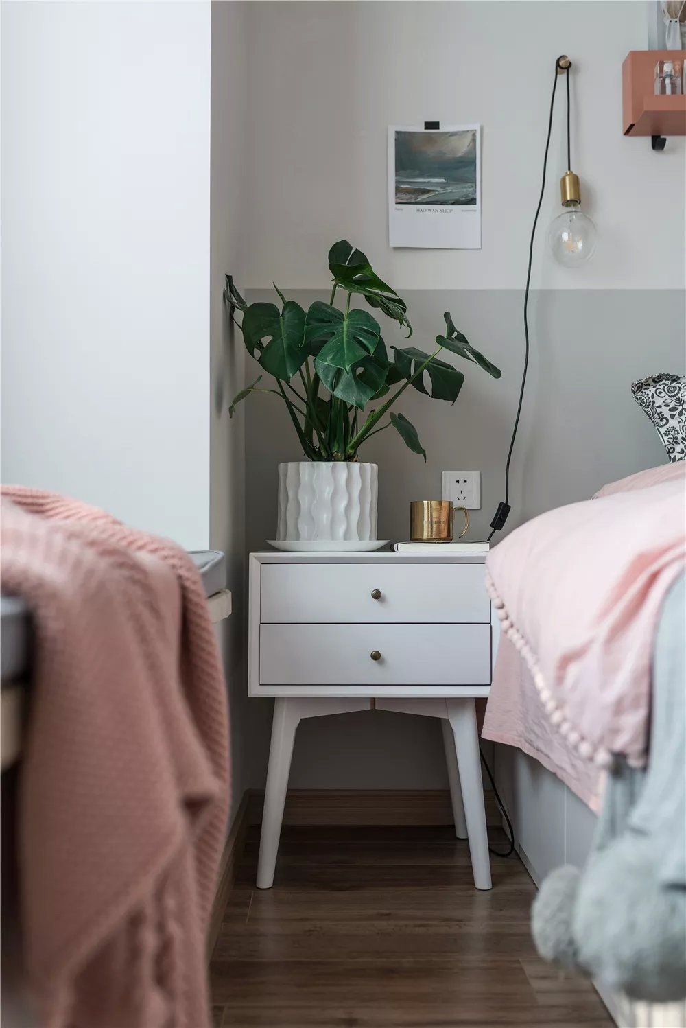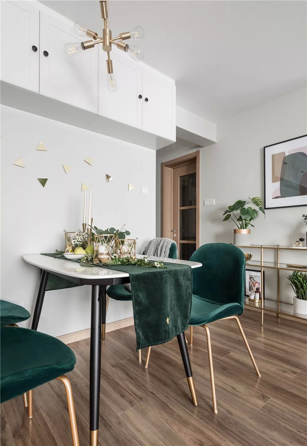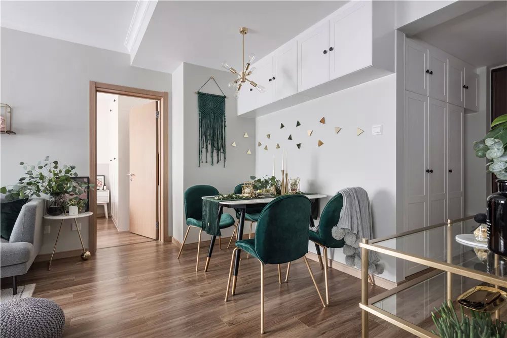 這是一套很經典的輕奢北歐風設計,金屬設計點綴著整個空間,提升整體的質感。綠色可以打造一種清新自然的感覺,時尚又大氣。次臥的空間較為緊湊,所以用的是榻榻米加組合柜的設計,簡單一面梳妝臺就能打造一個實用性極強的空間。