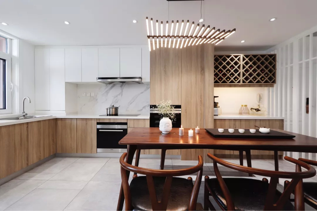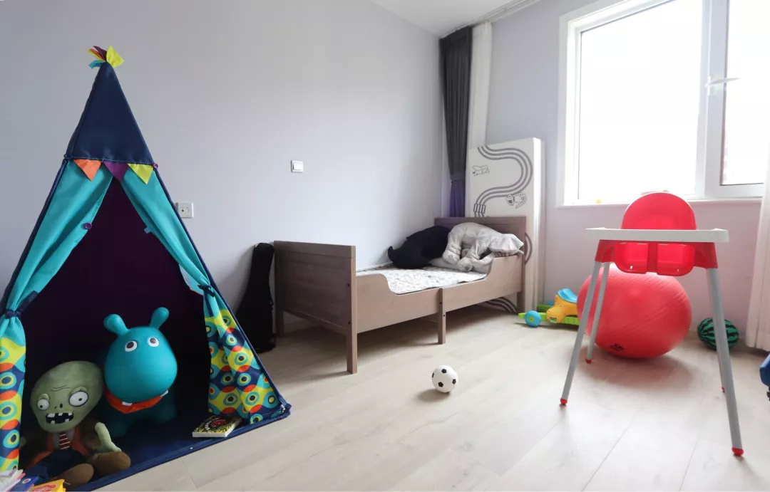 這是中式與現代風的完美融合,整體上偏向現代風,又融入了不少古典元素,整體上顯得大氣、高雅又不失設計感。兒童房的設計盡顯童趣,并不會顯得太古板。