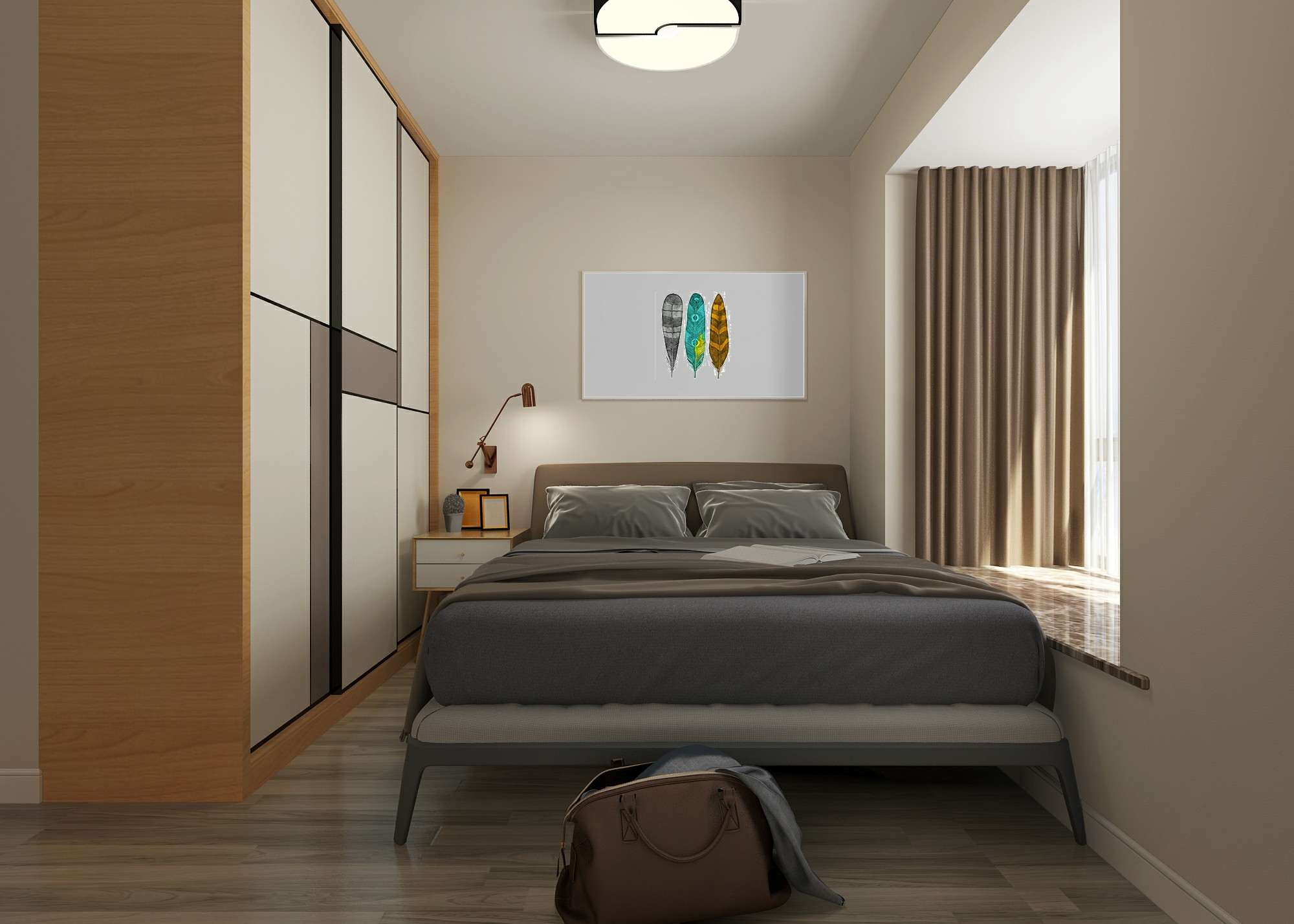 次臥的面積比較小,但是采光很好,設計師減去了不必要的家具與裝飾,簡簡單單地打造了一個溫馨舒適的睡眠環境。臥室的窗簾最好使用垂感厚重的材質,遮光性強,這樣白天休息的時候才不會被光線困擾。